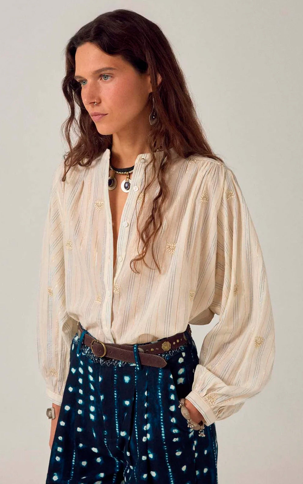 Blusa en algodón blanco roto con finas rayas verticales tejidas con un sutil hilo de...
