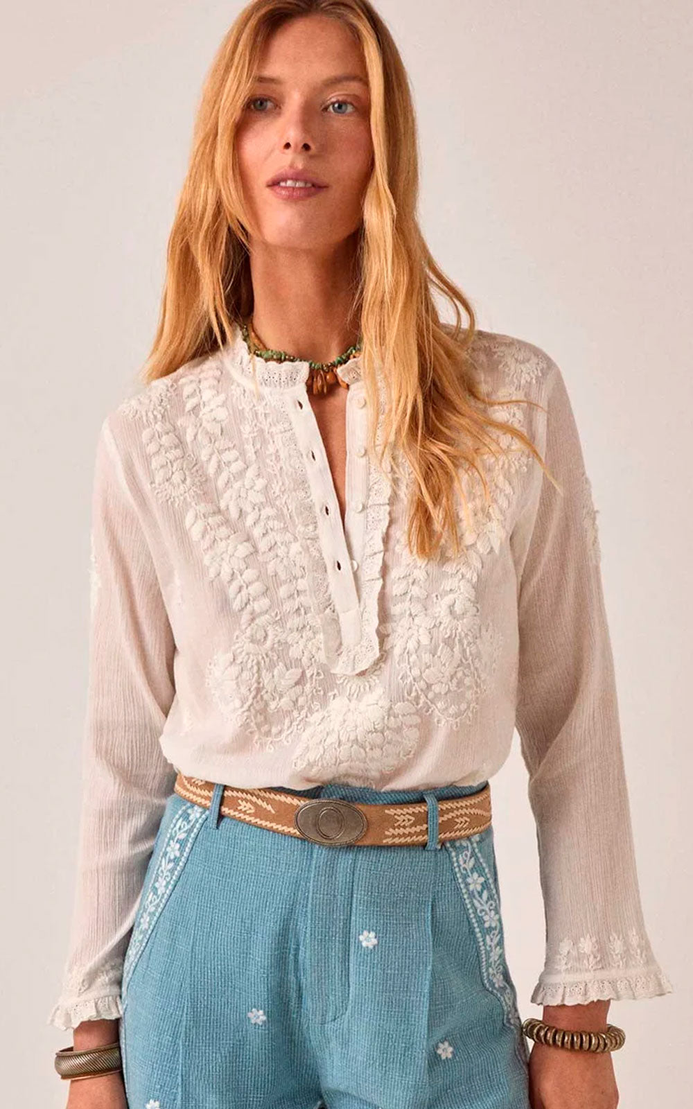 Blusa blanca en algodón con un tono cálido y natural que suaviza la pureza del...