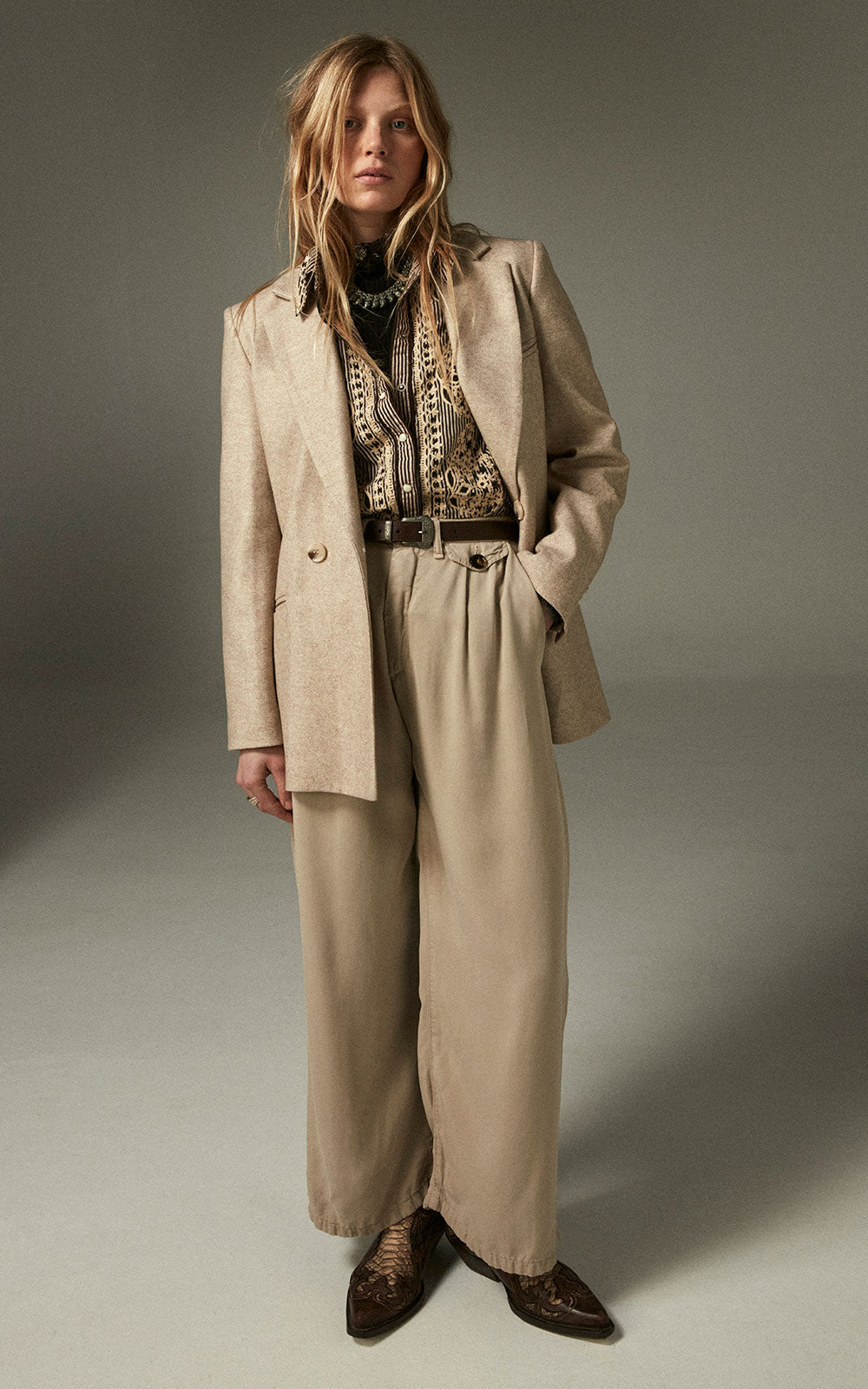 El Blazer Jackie está confeccionado en una mezcla de lana con tejido espiga que aporta textura...