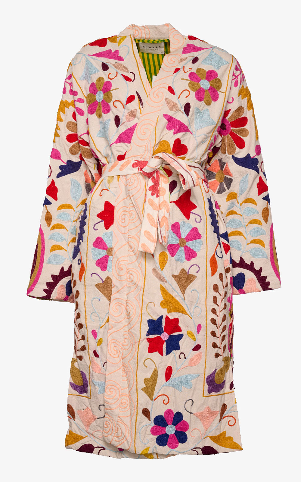 This kimono is made from a vintage kantha cotton blanket and decorated with colorful suzani...