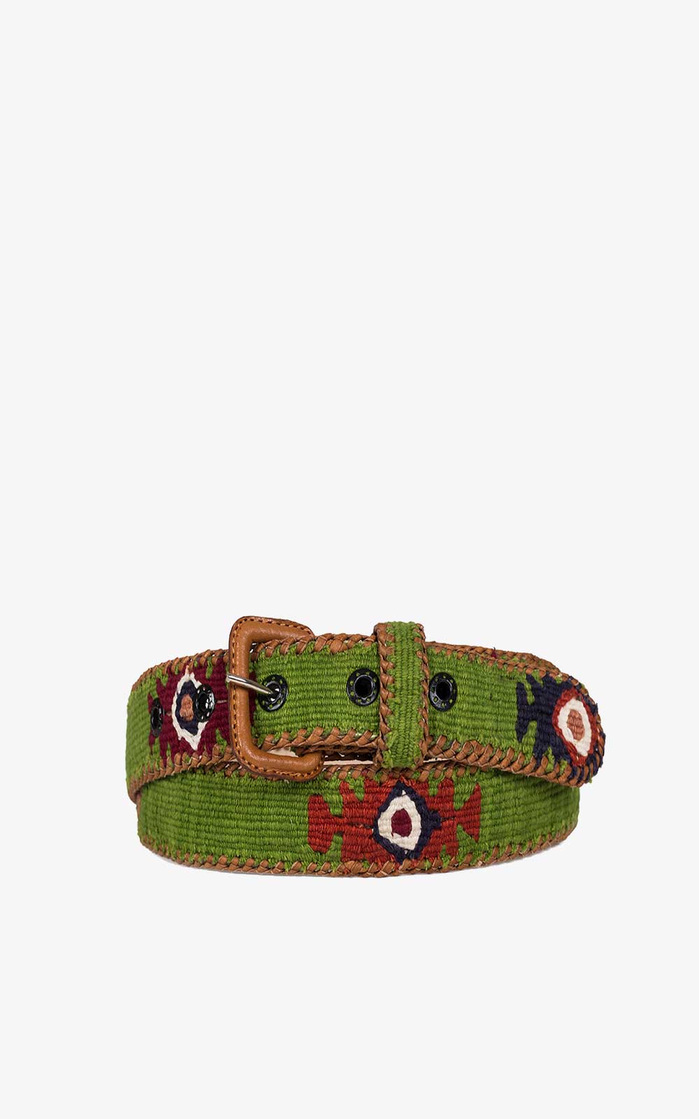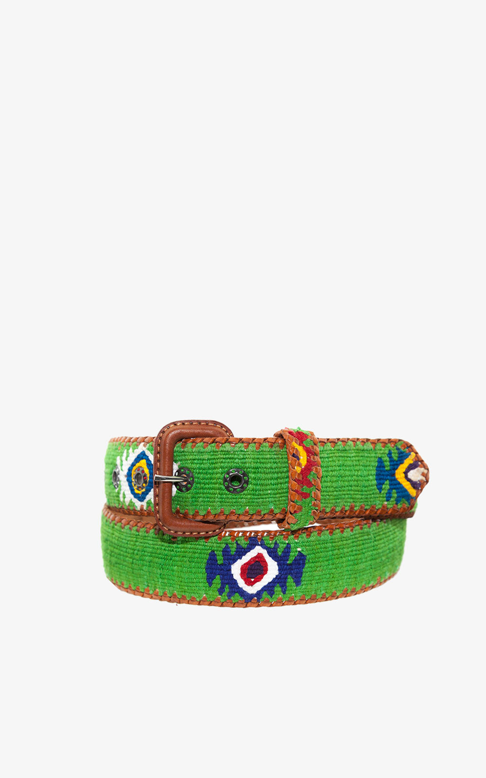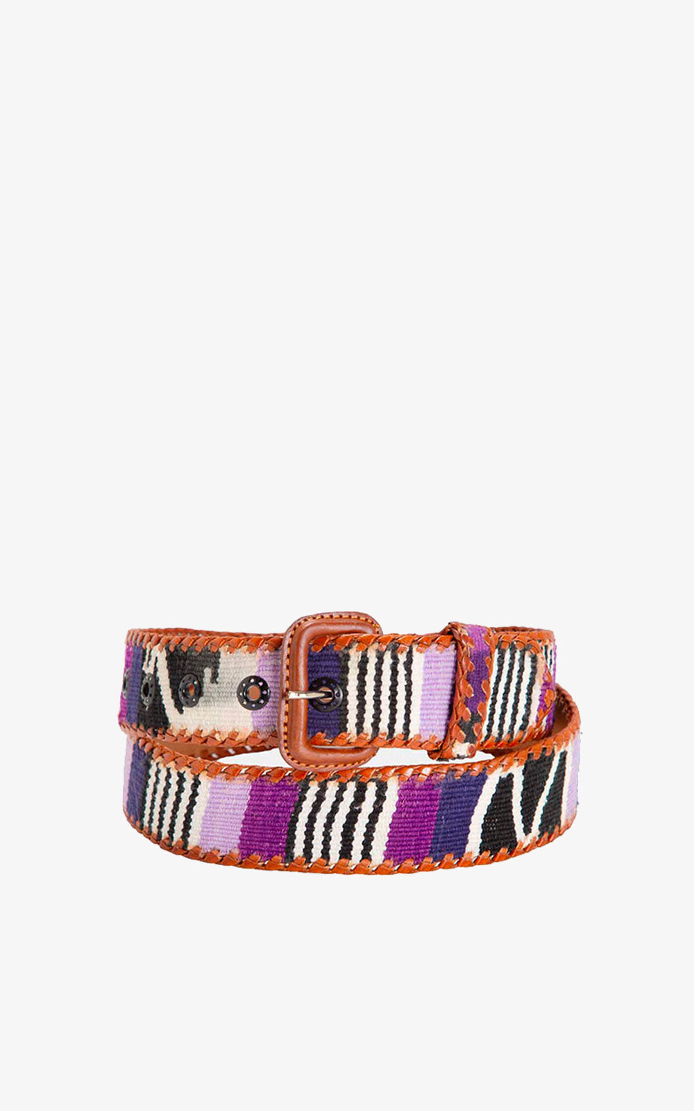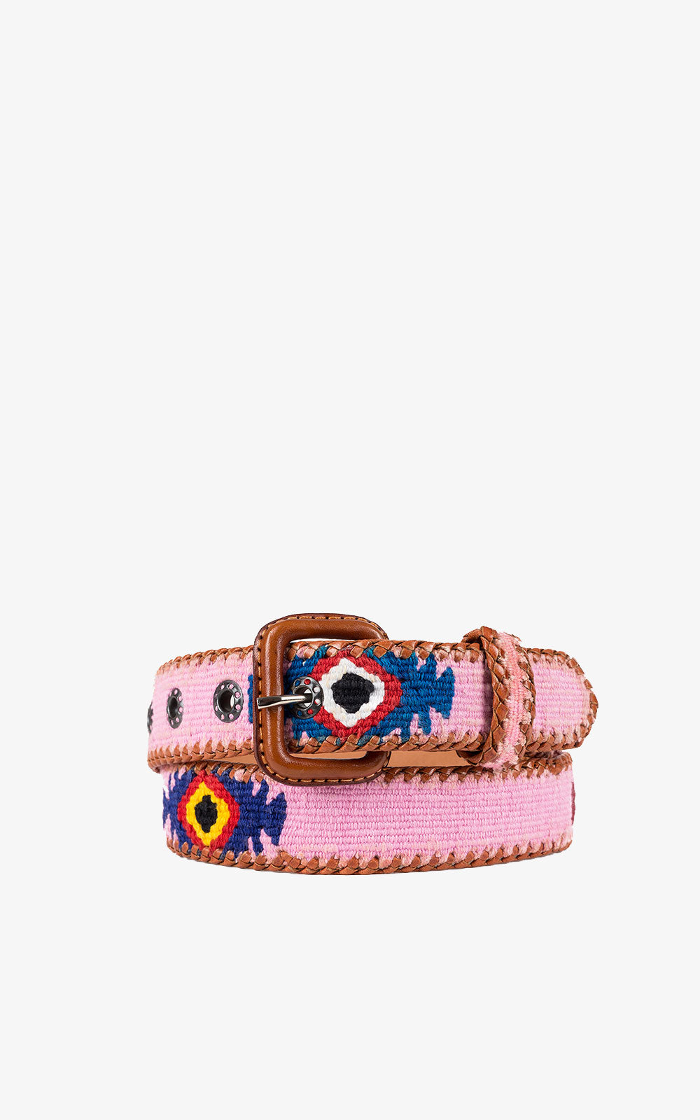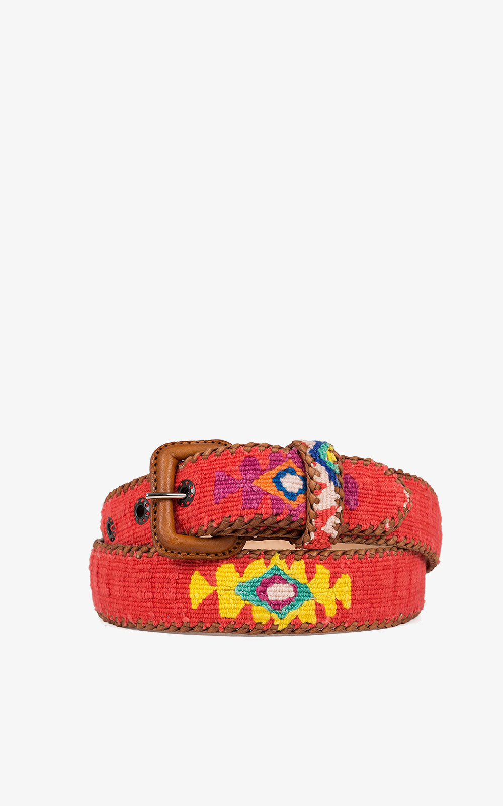 Leather-based belt on which cotton threads are woven. The side finish is a braided natural...