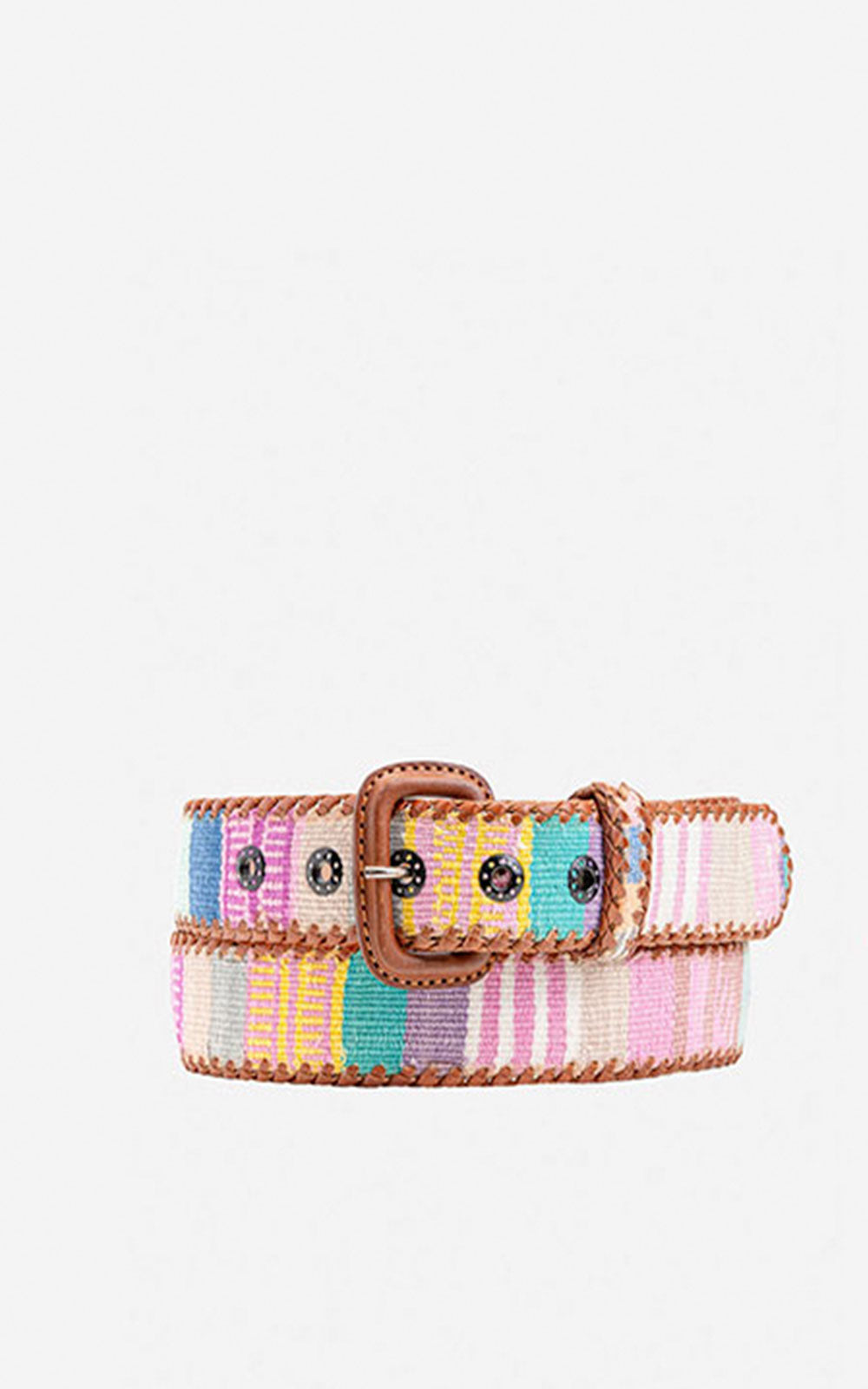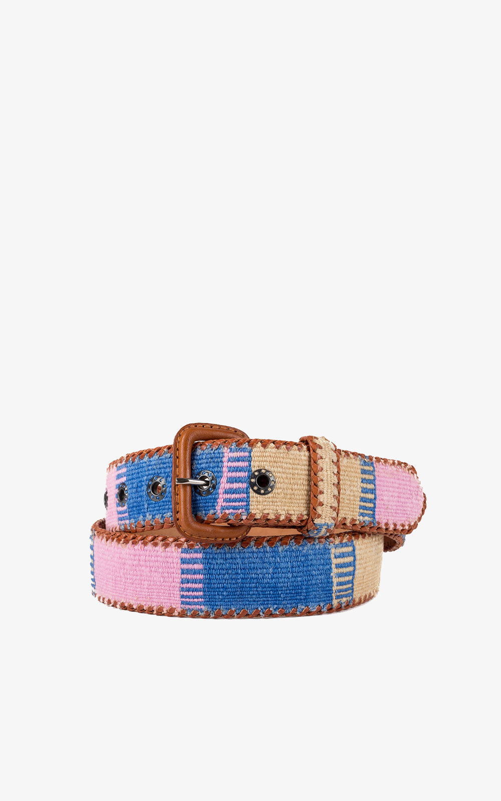 Belt with a leather base over which cotton threads are woven. The side trim is...