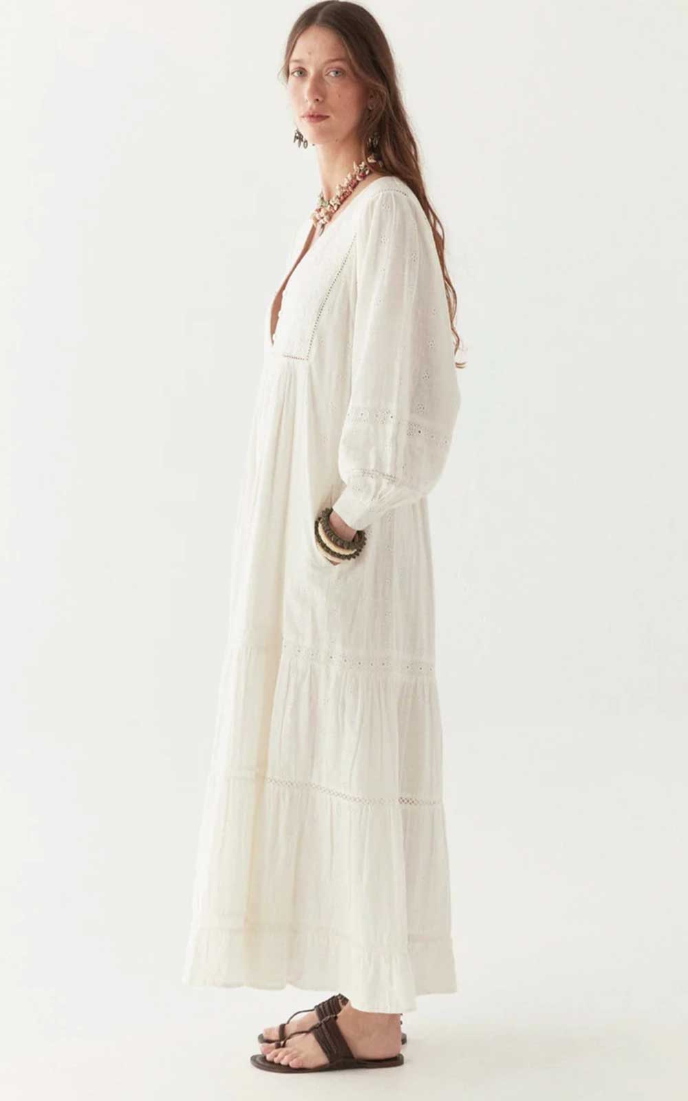 The puffed sleeves and gathered waist maintain the effortless fluid silhouette. The type of dress...