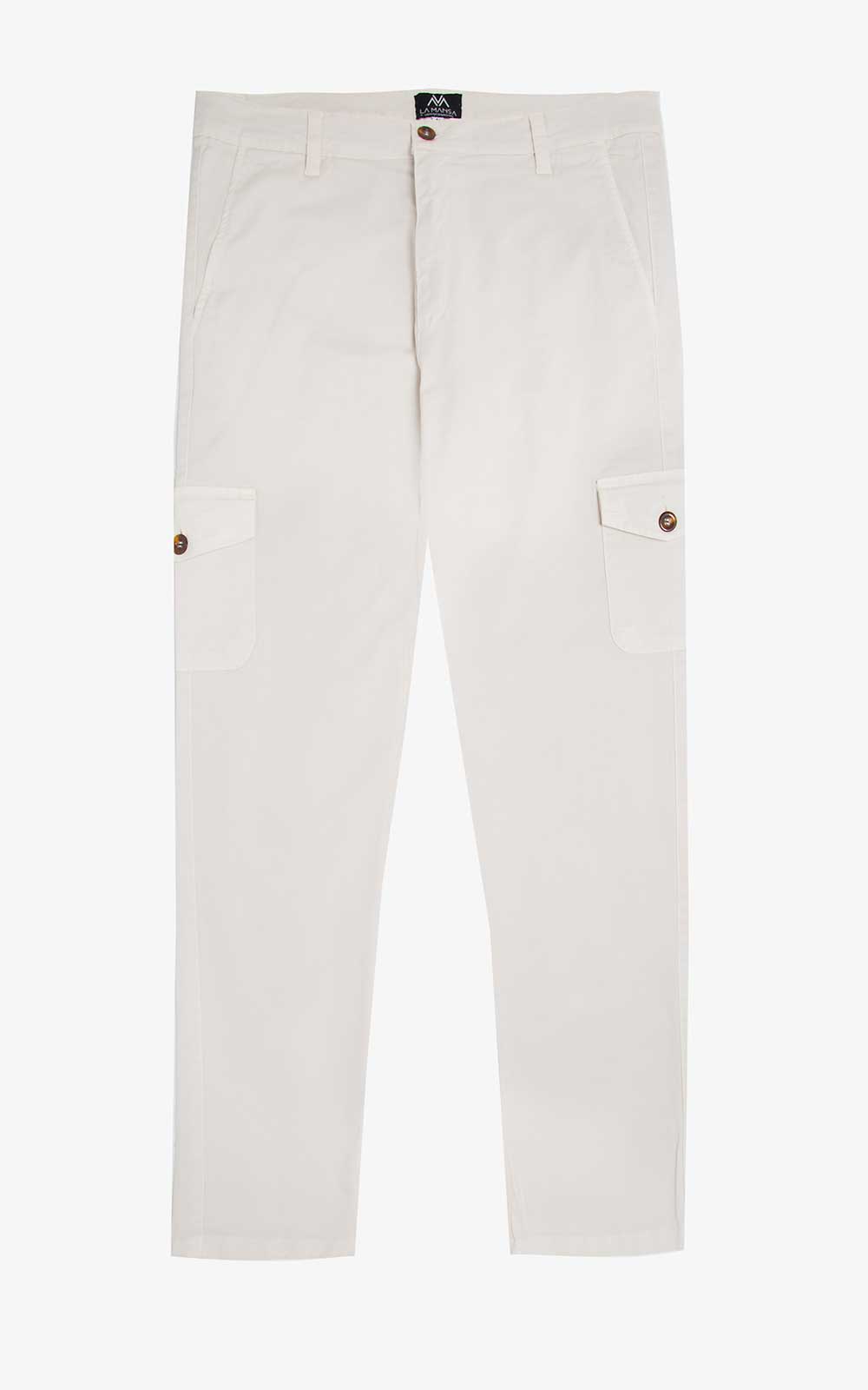 Cotton pants with a little elastic It has side pockets with a button at mid-leg...