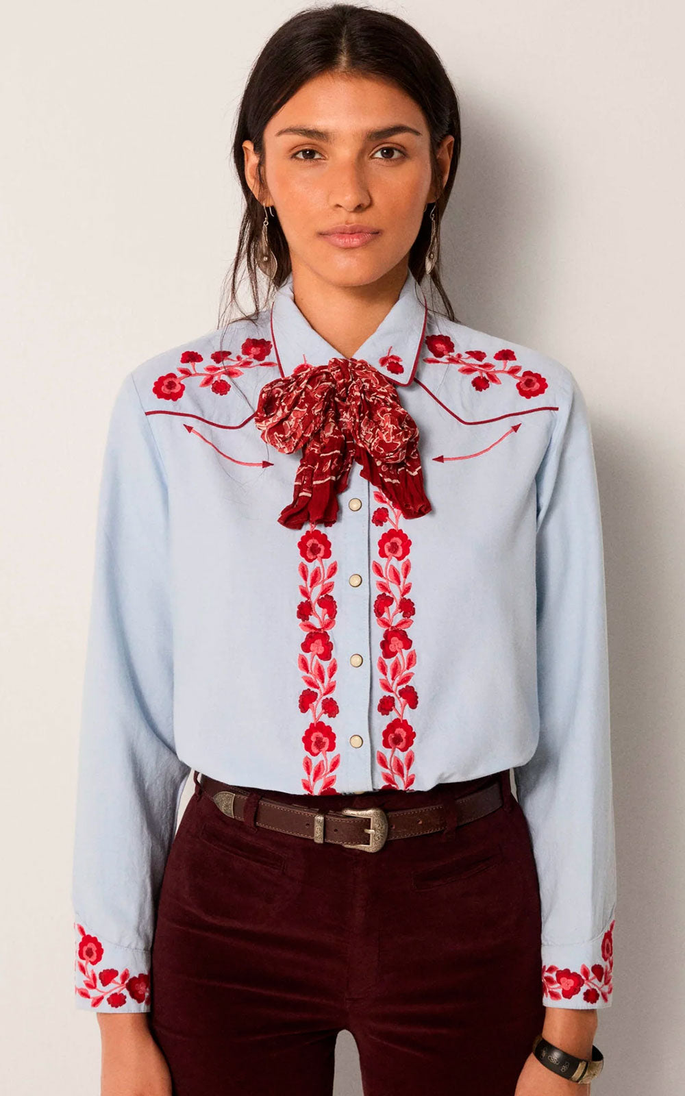 La Blusa Jose está confeccionada en algodón azul cielo, de textura suave y ligera, con un...