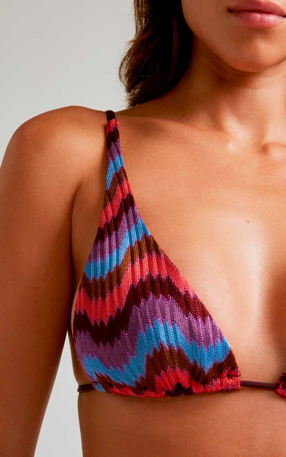 Curtain bikini made of crochet with metallic thread, halter style and wave print in violet tones. Choose your top size and your bottom size. Don't forget to add both items to the cart