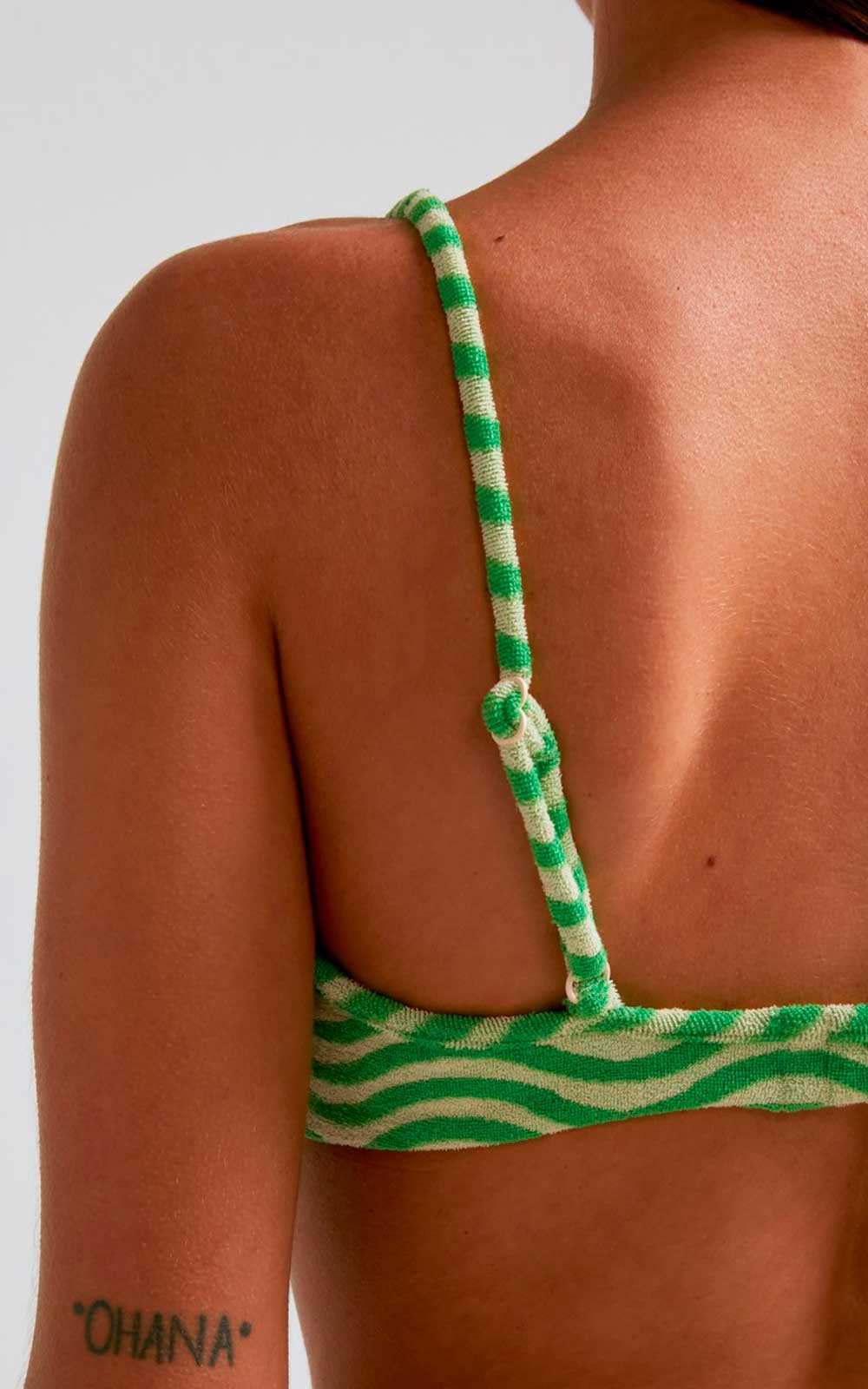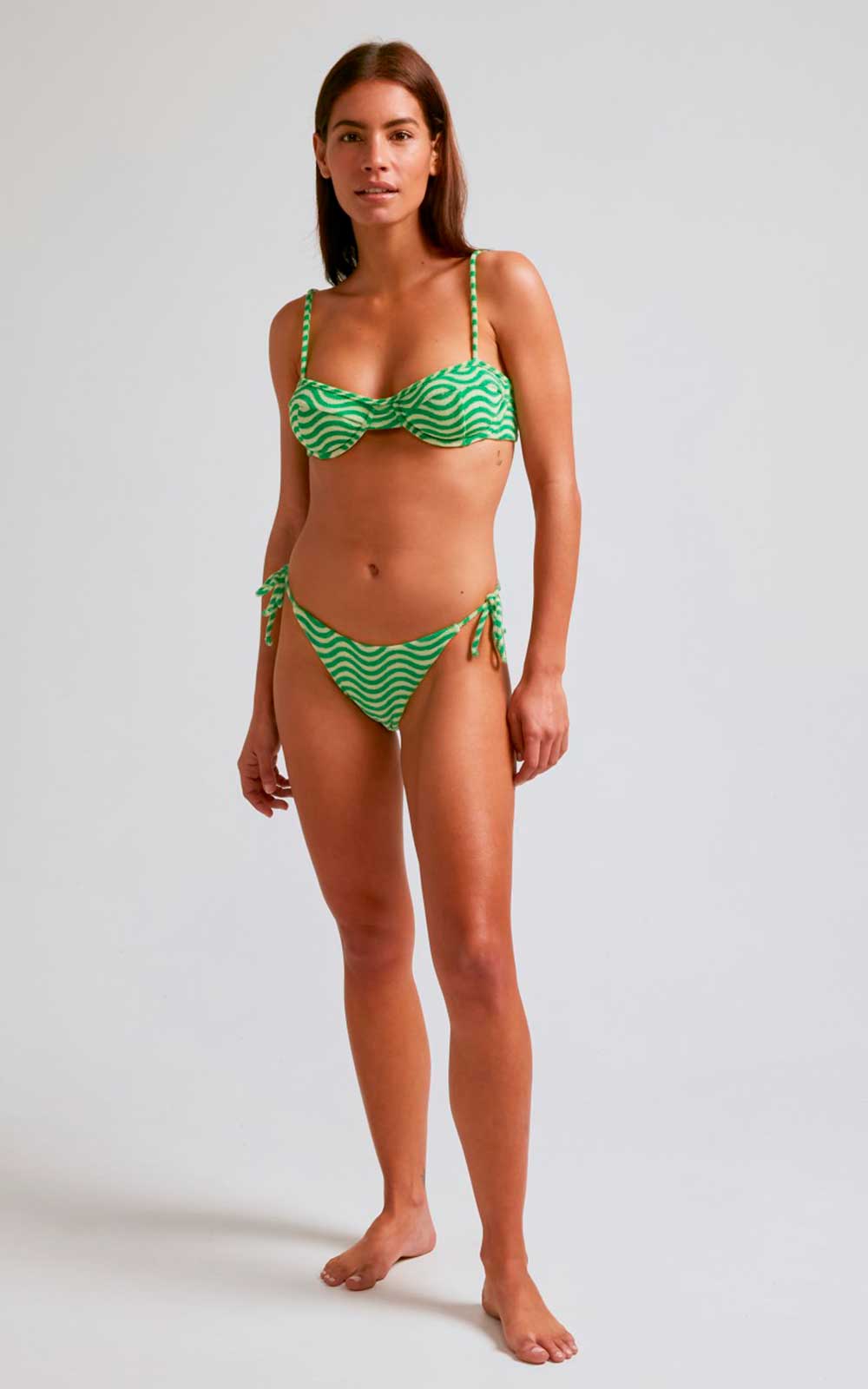 Bandeau-style balconette bikini with green and raw waves, in towel-effect fabric special for bathing. Choose your top size and your bottom size. Don't forget to add both items to the cart