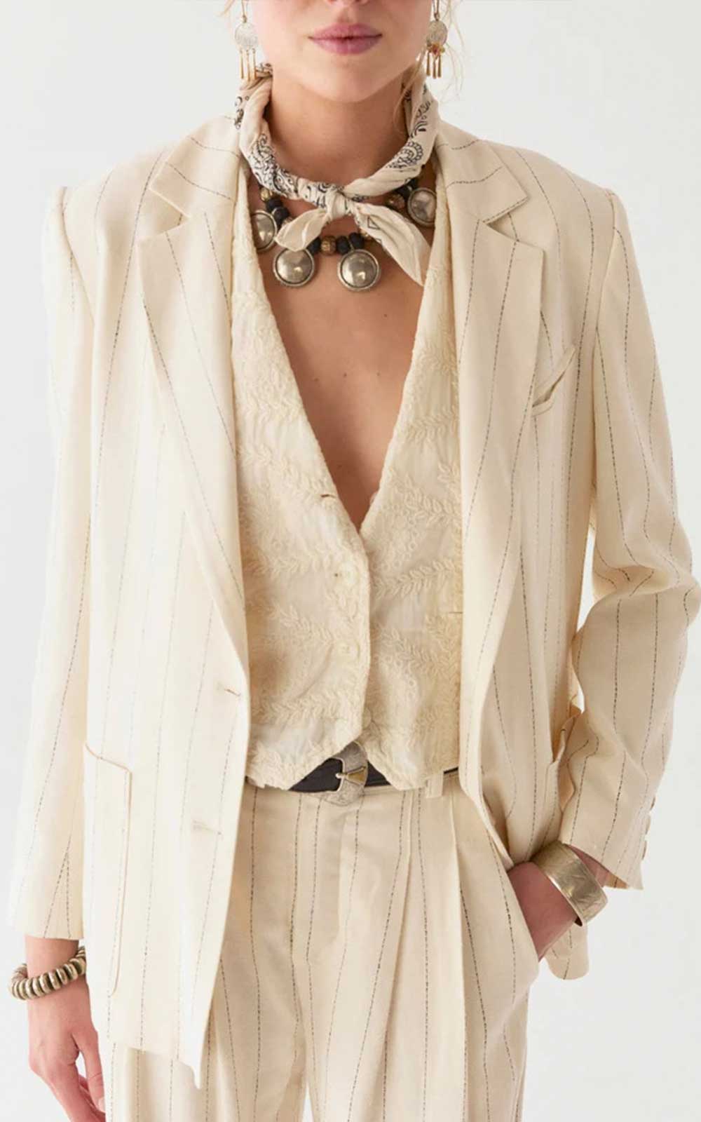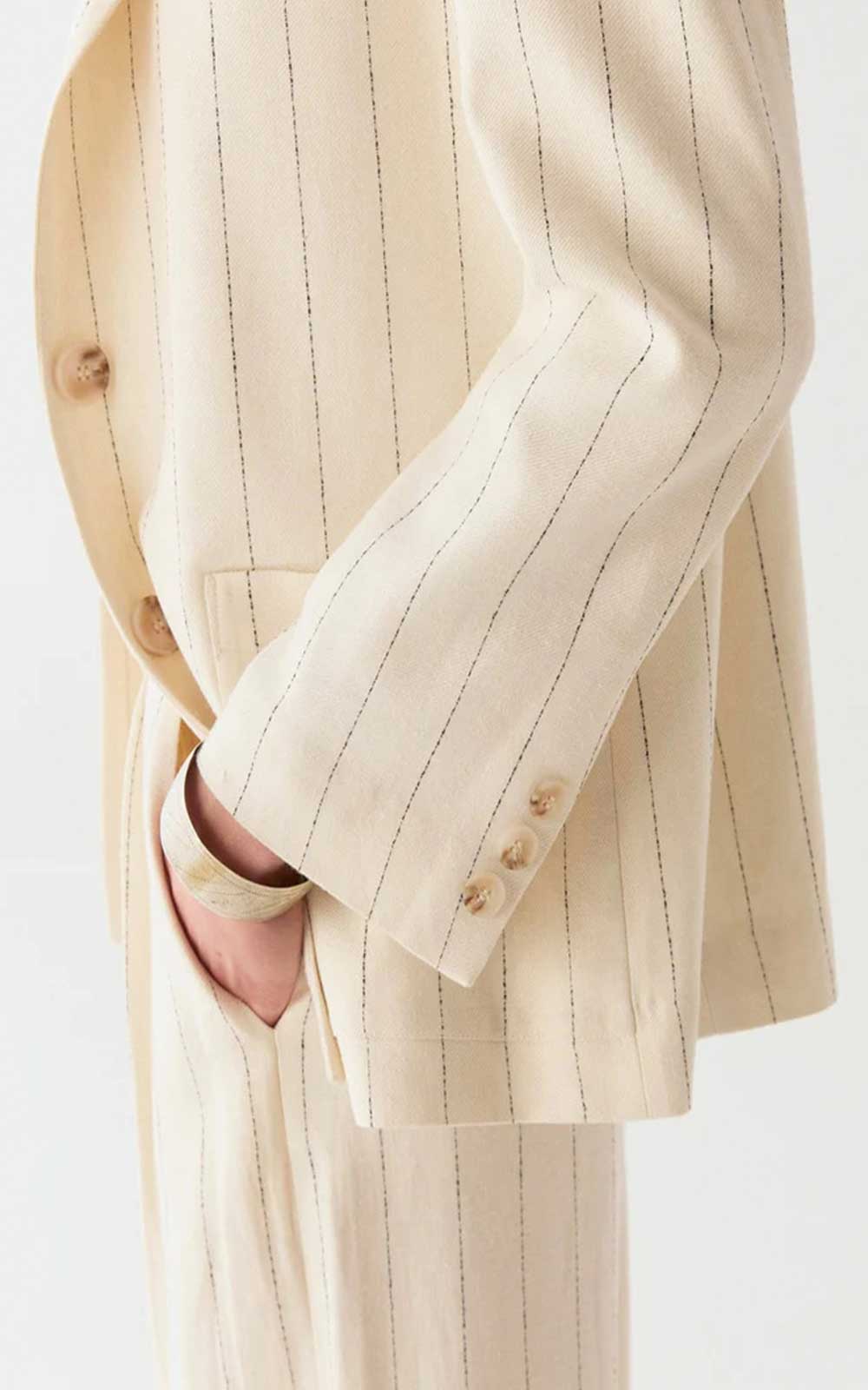 A cotton blazer with fine vertical stripes adds a touch of elegance, while the loose fit, tortoiseshell buttons, and front pockets add a casual touch.