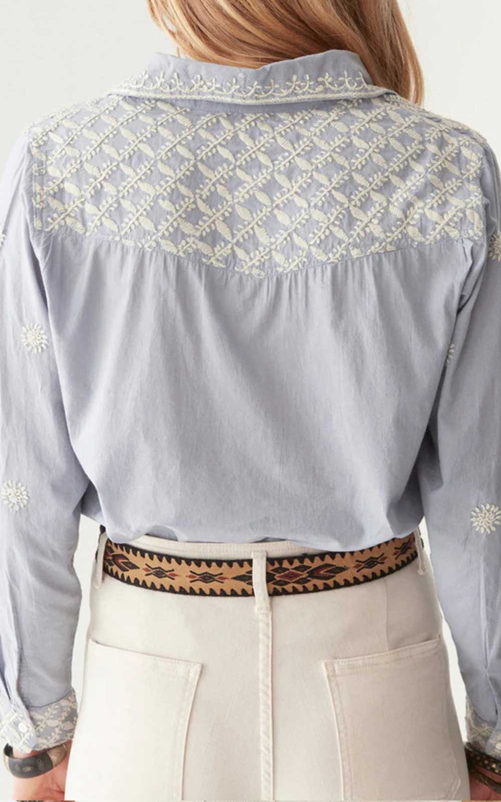 Subtle yet defined, this is the kind of garment that doesn't conform: it adapts, changes, and moves with you. It has a muted indigo tone, somewhere between twilight and stone, with intricate hand-embroidered ivory "chikan" embroidery tracing its surface like a silent statement.