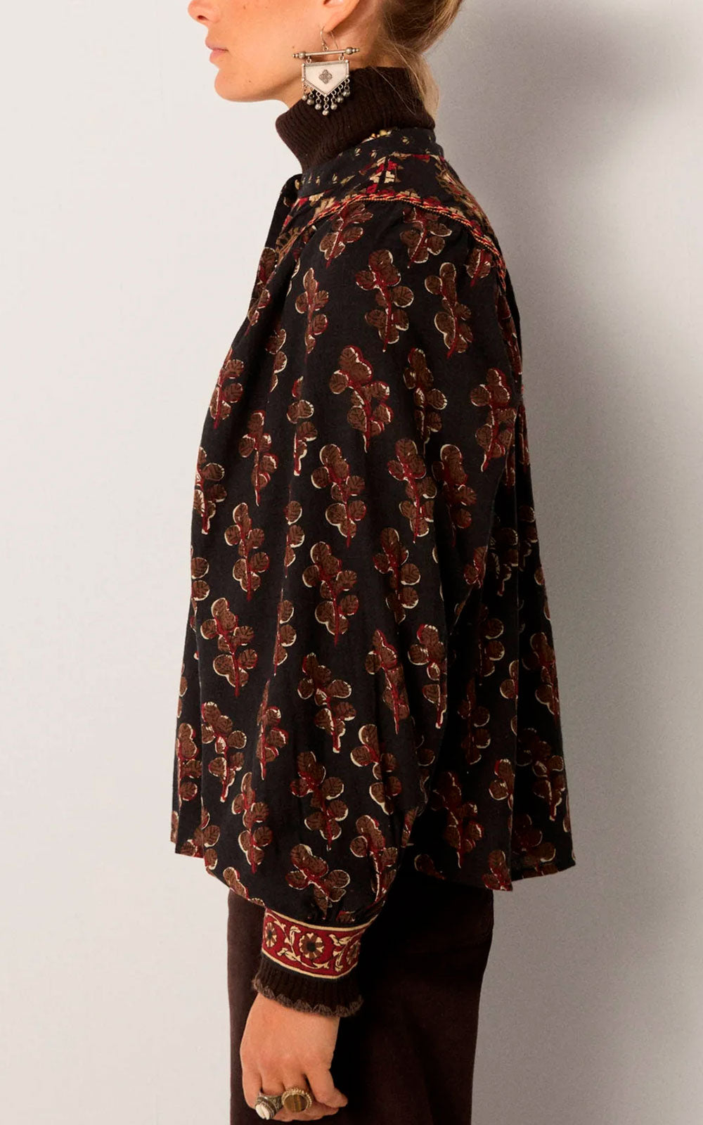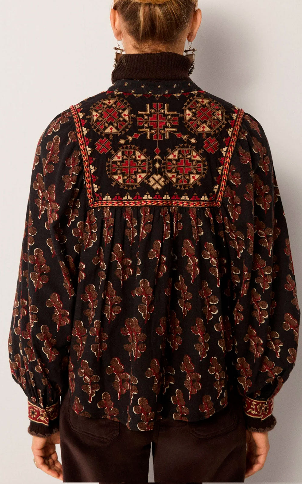 El diseño se enriquece con delicados bordados florales en tono escarlata que se despliegan sobre la superficie, enmarcados por un canesú geométrico que aporta contraste y equilibrio. Pequeños frunces en los hombros completan el conjunto, reforzando su carácter artesanal sin perder sencillez.