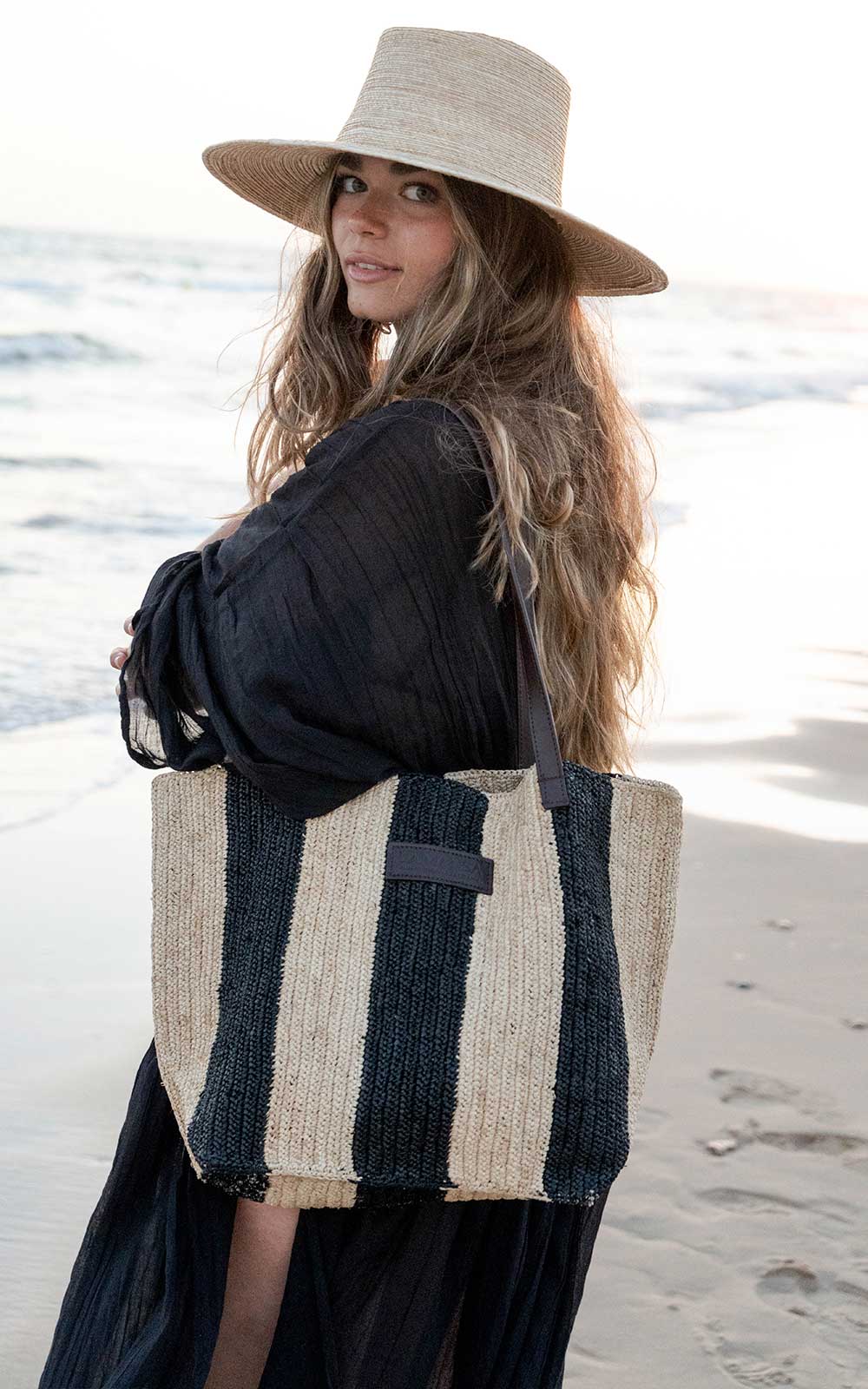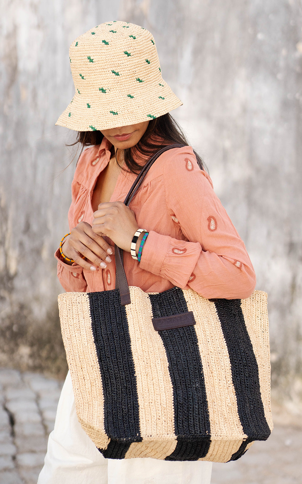 Bag made with natural raffia by artisans from Madagascar. The handles and print are made of vegetable leather that we work in our workshop in Ubrique. This bag is designed to be carried comfortably by men. The interior is also made of raffia and has a pocket.