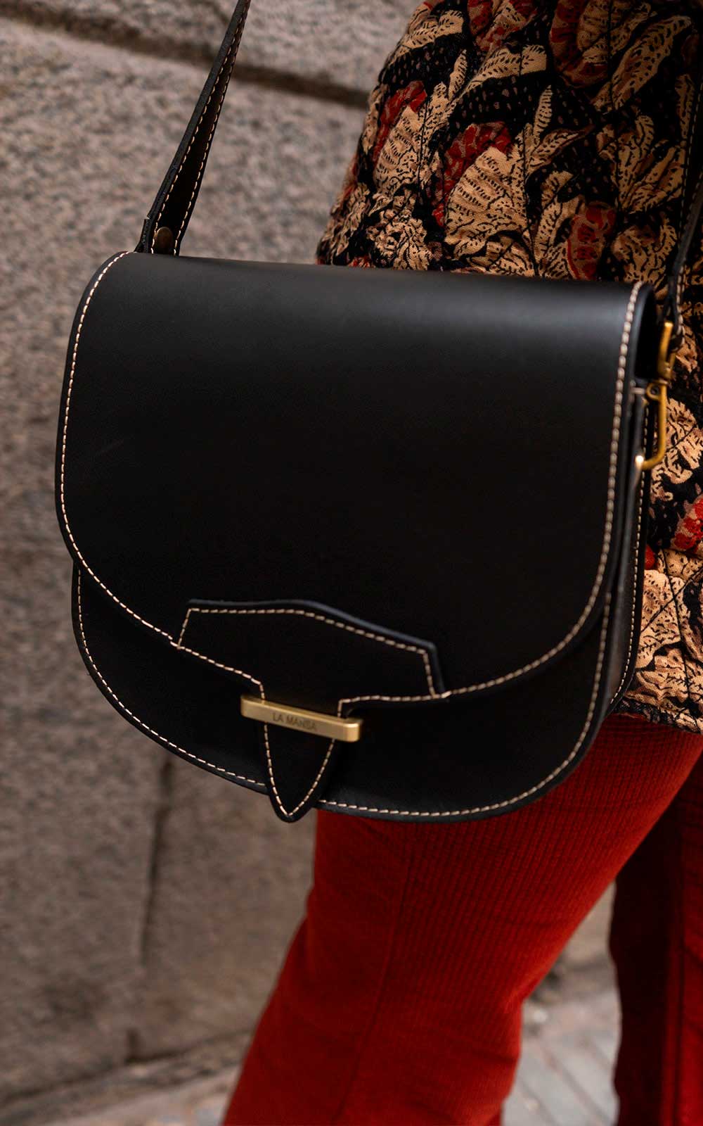 - The handle is made of leather with embroidered detail in raw color.