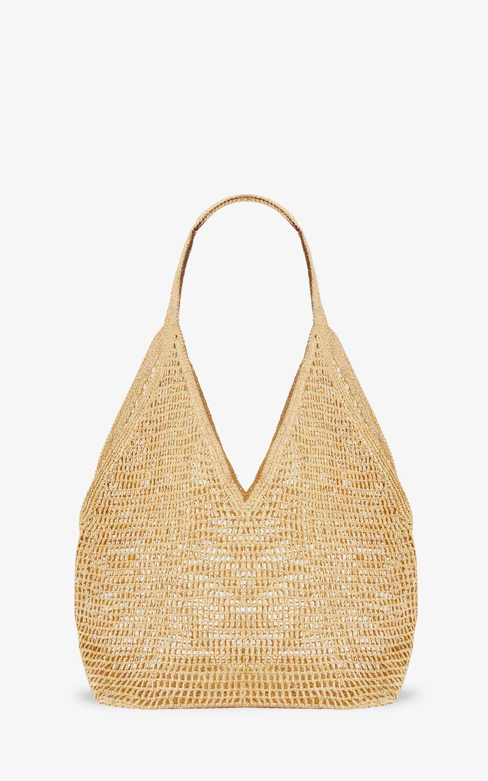 Natural raffia mesh-style bag handmade by artisans from Madagascar. The interior is made of raffia, it is not lined with fabric.
