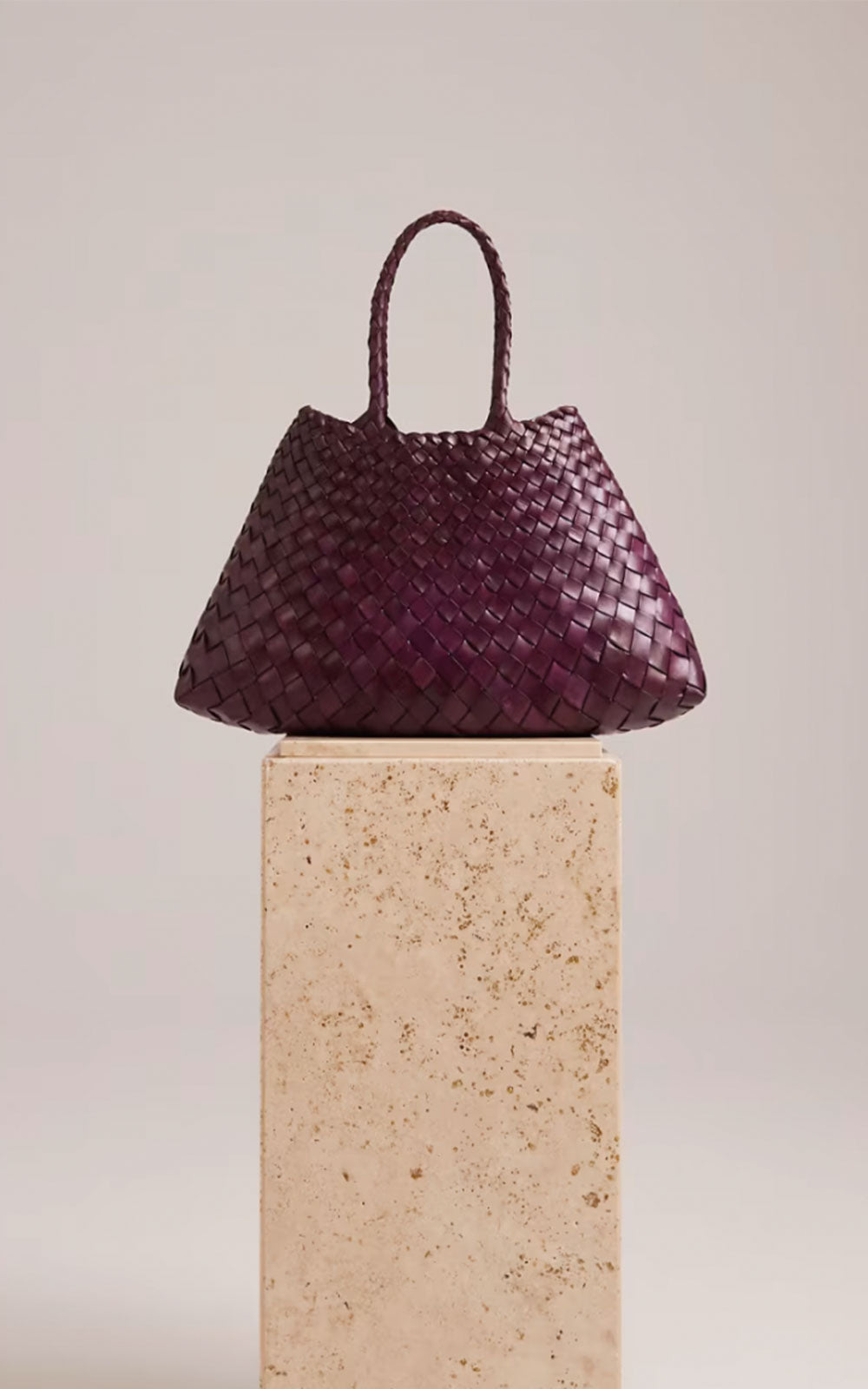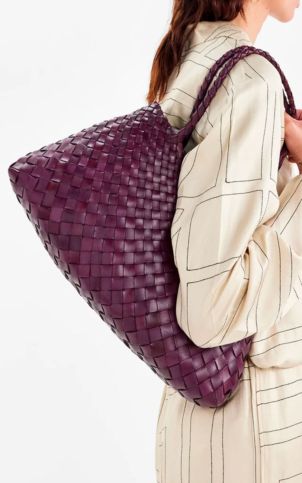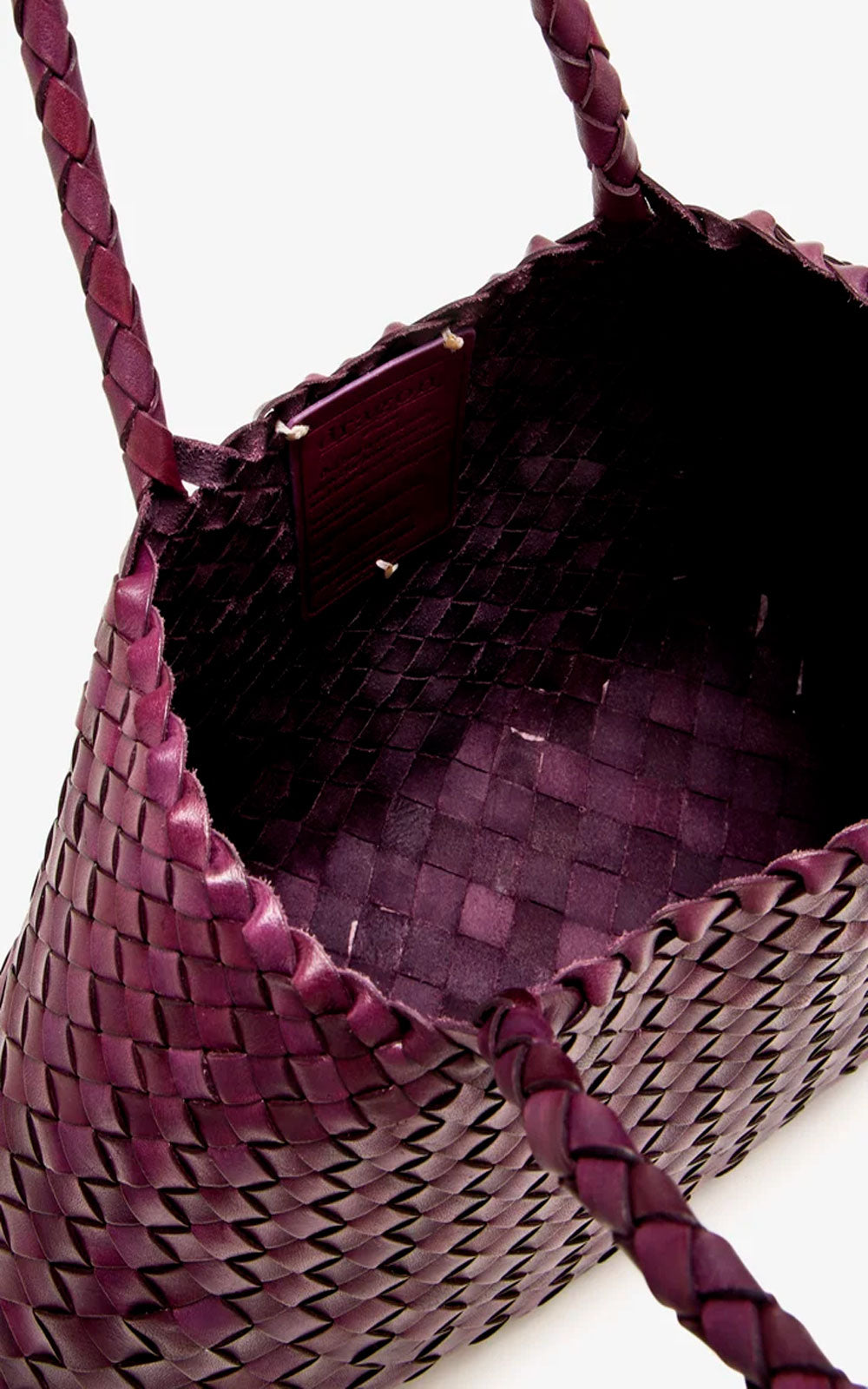 El bolso Santa Croce en color ciruela profundo (plum) es un bolso tejido a mano con tiras de piel de ternera búfala, cuidadosamente entrelazadas para crear una silueta que se estrecha hacia la parte superior. Su diseño artesanal mantiene la esencia de las técnicas tradicionales de cestería, resultando en una pieza ligera, práctica y naturalmente elegante.