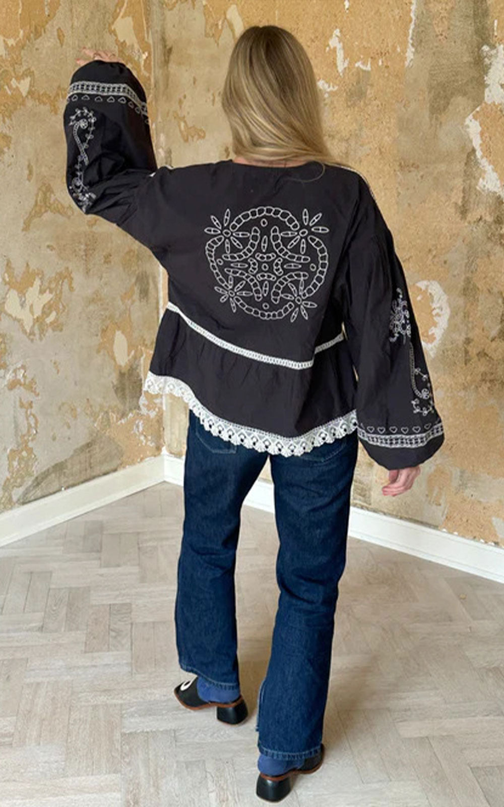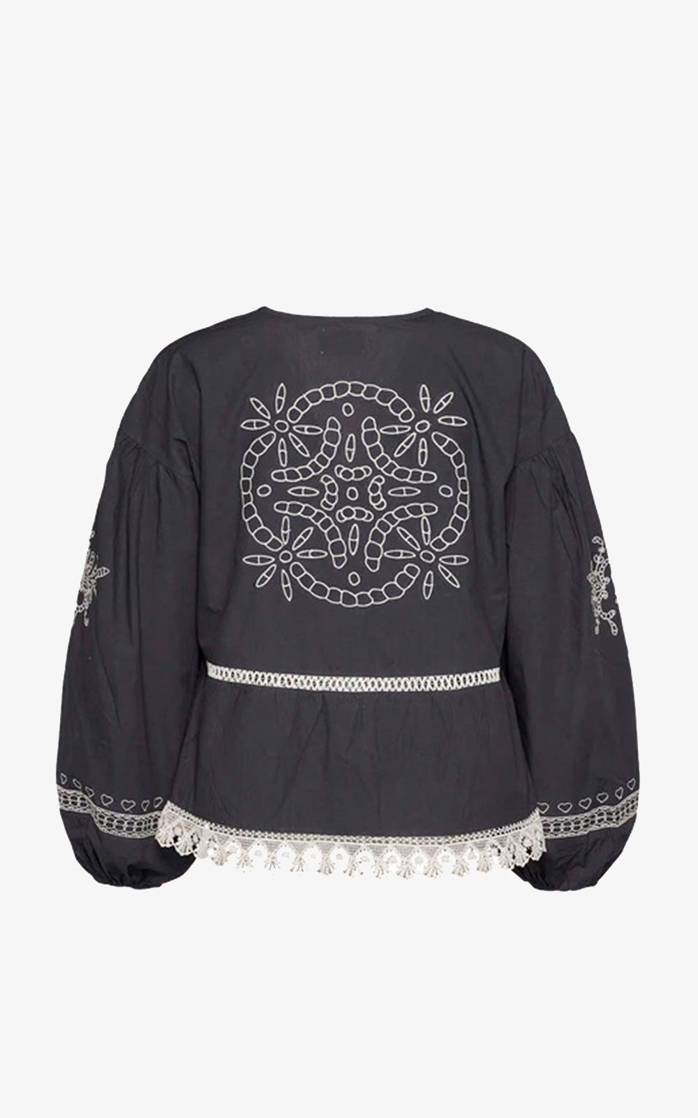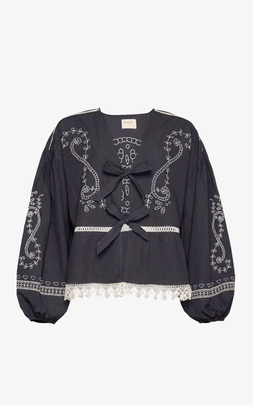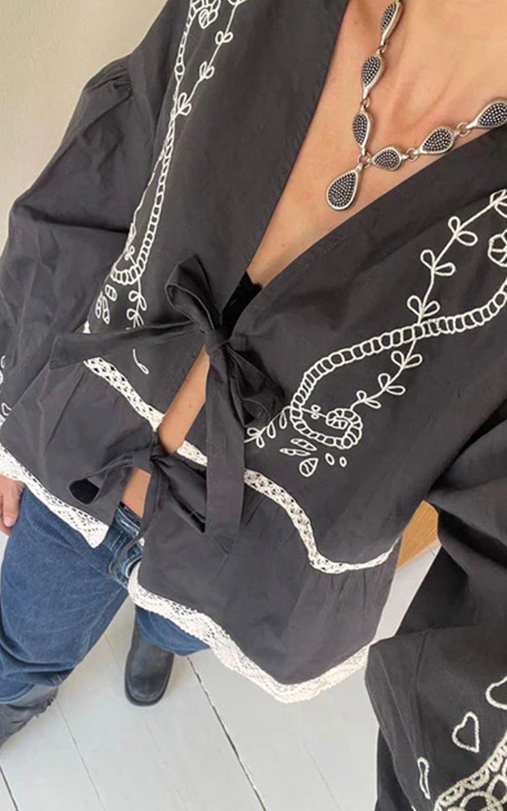 It features dropped shoulders and voluminous sleeves with elastic slits. The top is made with front ties and decorated with pretty white lace trim.
