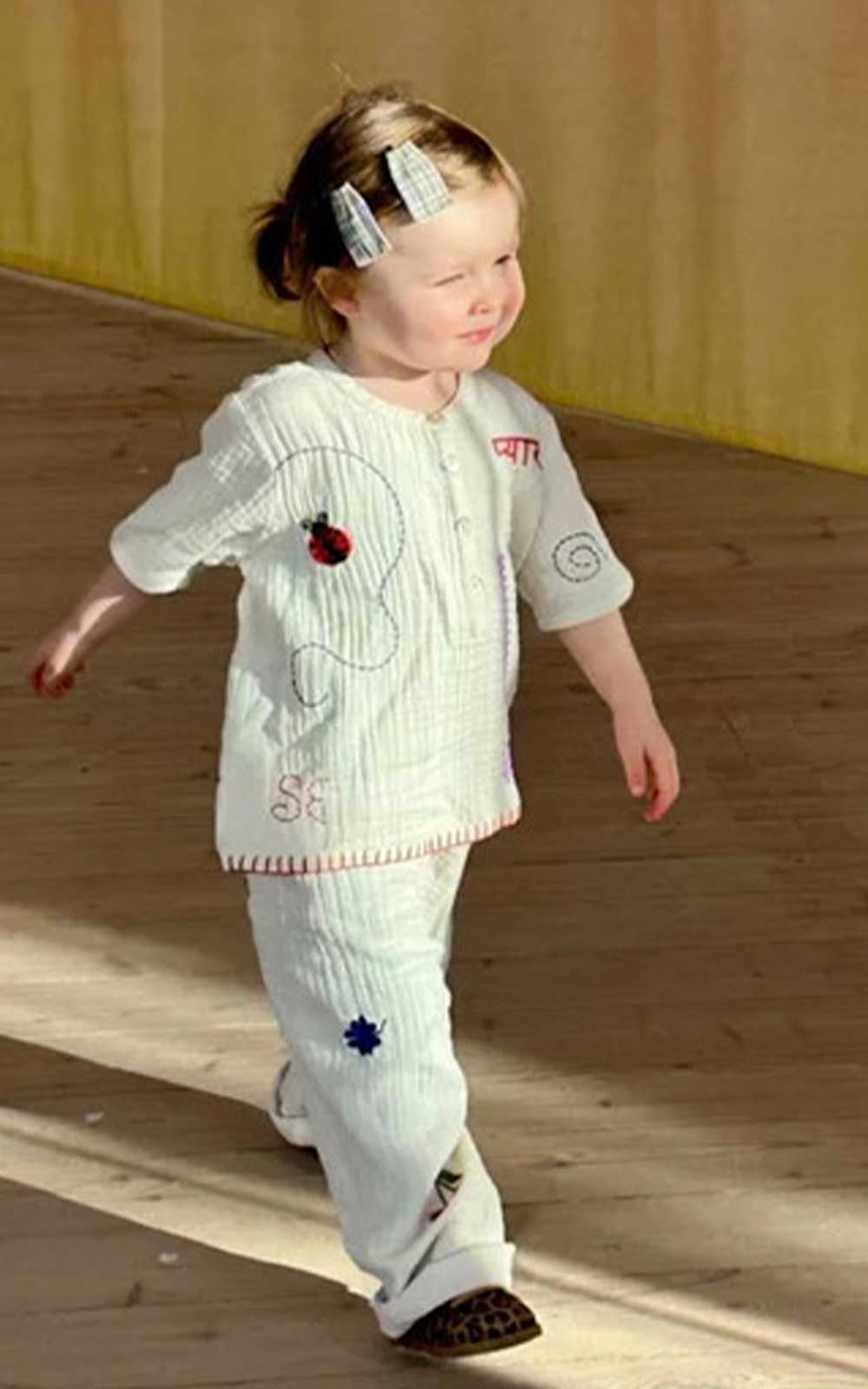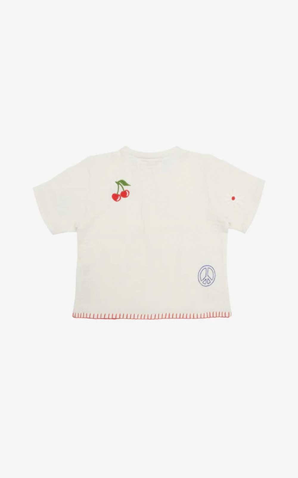 The Ragnhild mini top is made from soft double gauze of 100% organic cotton. It has short sleeves, an O-neck, a small collar, and a placket with mother-of-pearl buttons. The top is decorated with various embroidered motifs, and the lower hem and the cuffs of the sleeves are made with embroidered blanket stitch.