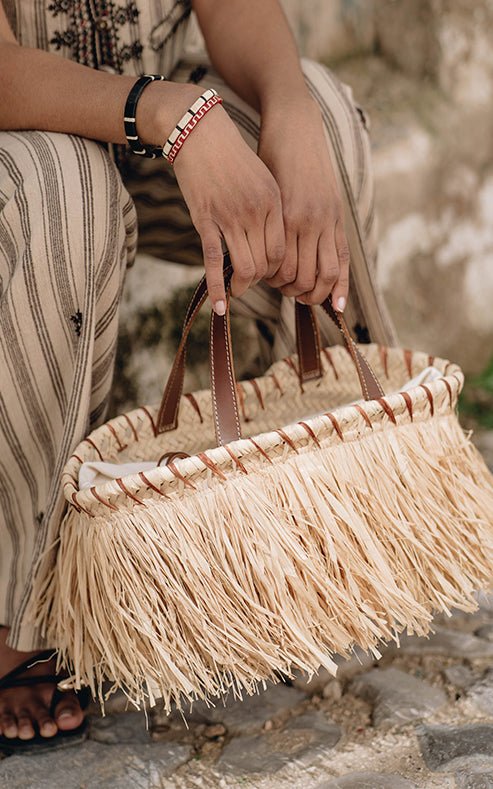 - Completely made of natural raffia and vegetable leather