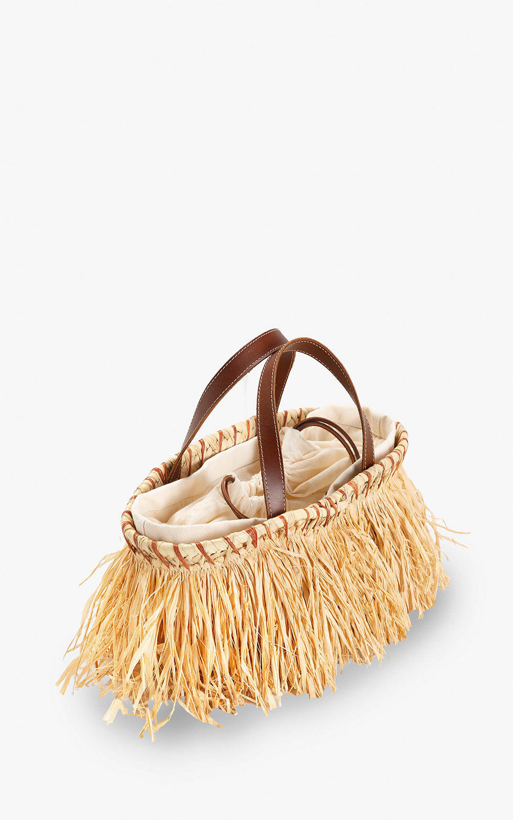 Mini natural raffia basket with a vegetable-tanned leather handle and braided trim. The interior is made of fabric.