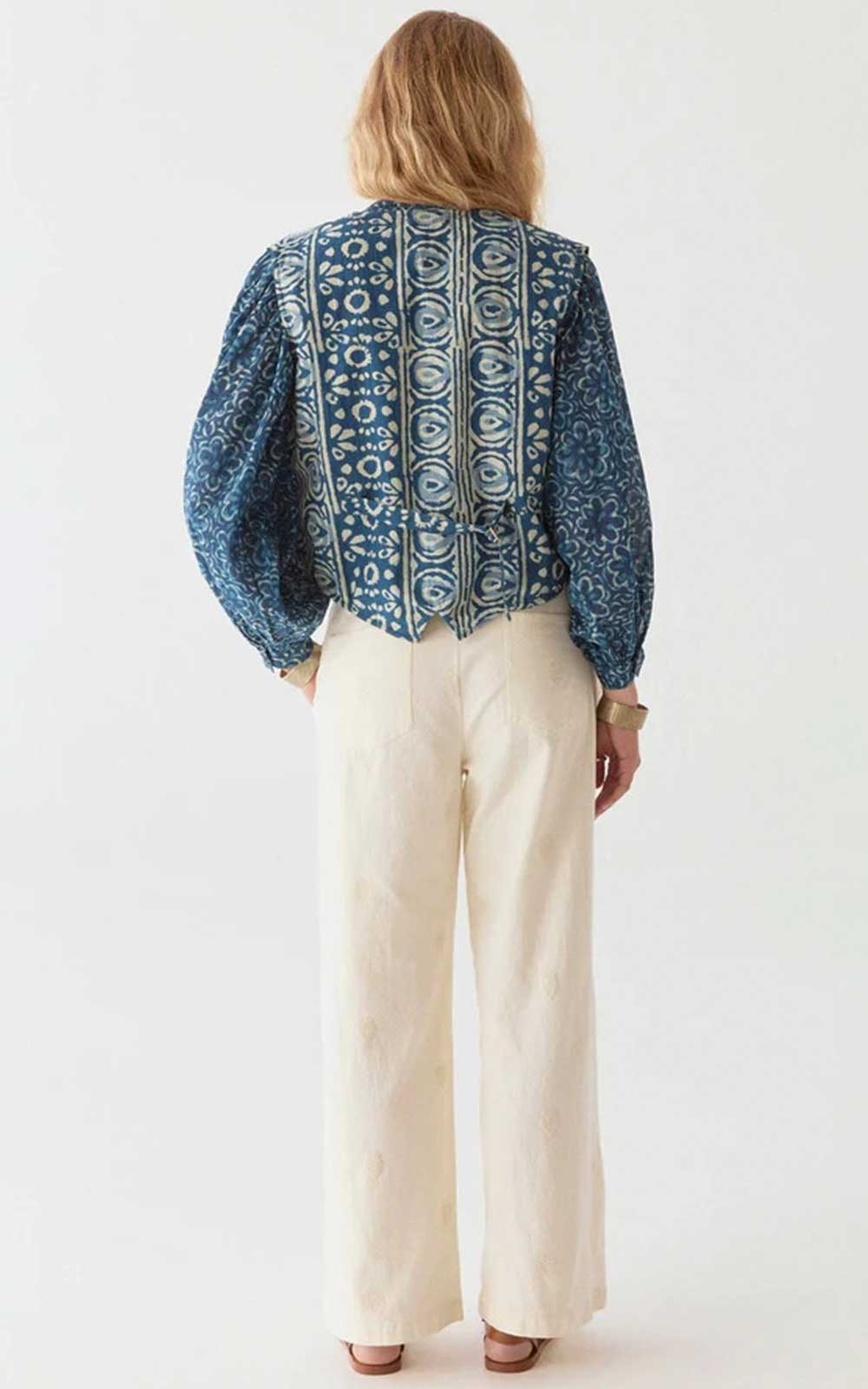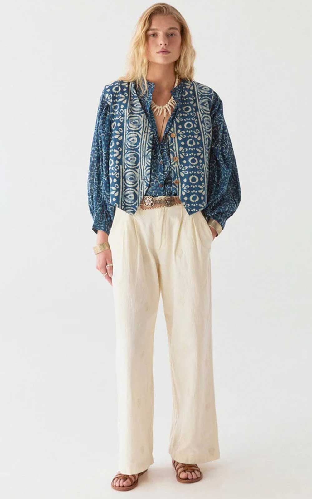 Crafted from lightweight cotton with a batik-inspired print that plays with depth, geometric patterns soar through the rich indigo like sea foam drifting on the tide.