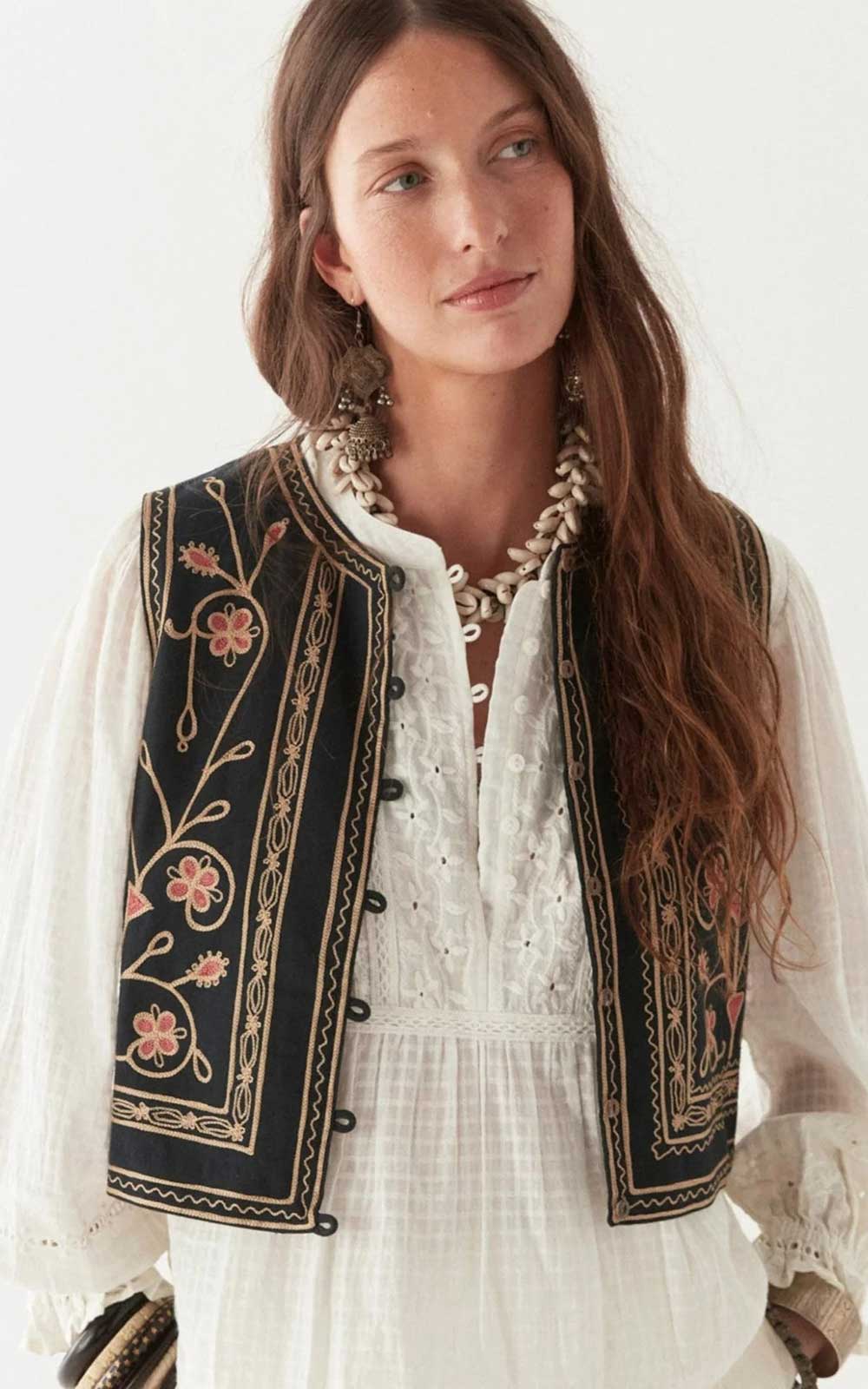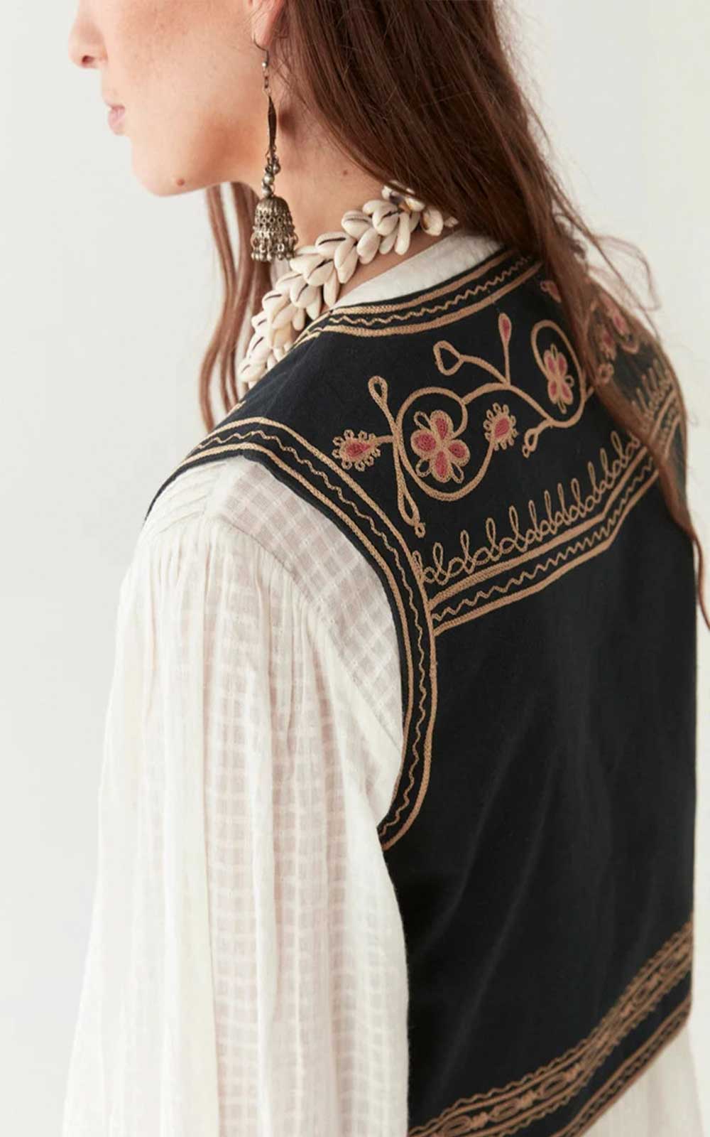 Midnight black cotton vest, with wild gold embroidery and deep armour, like tangled vines trailing through an amplifier.
