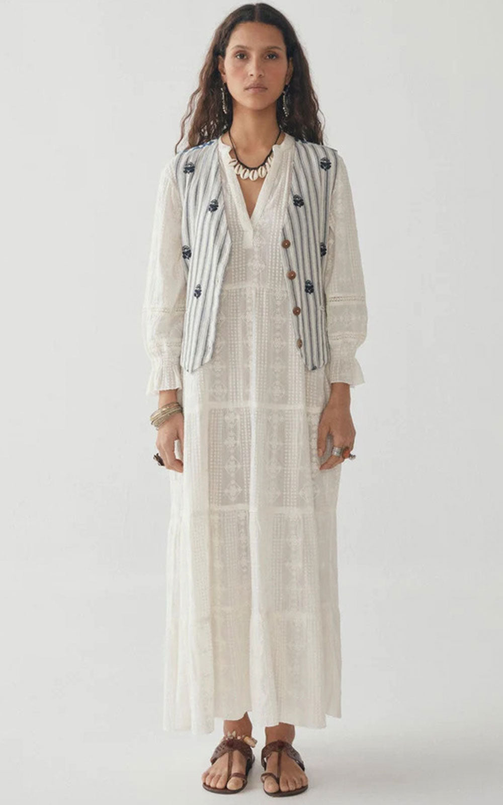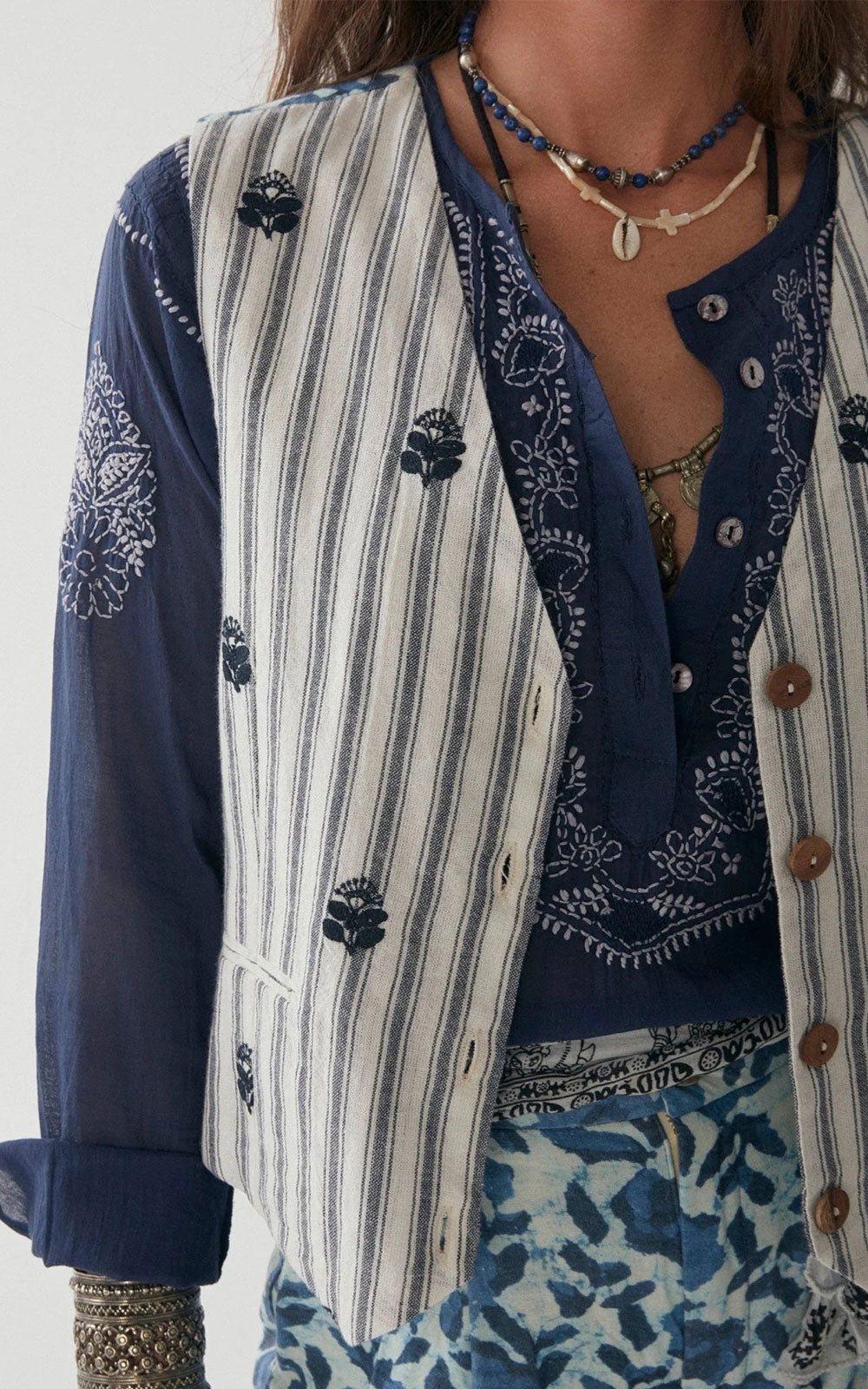 Vest made of a rustic cotton striped fabric with embroidered floral motifs all around. The wooden buttons add a very special finishing touch, but it's actually the contrasting indigo floral print on the back that puts the icing on the cake. Ideal to wear to match the Indira pants.