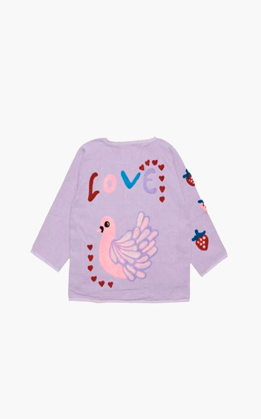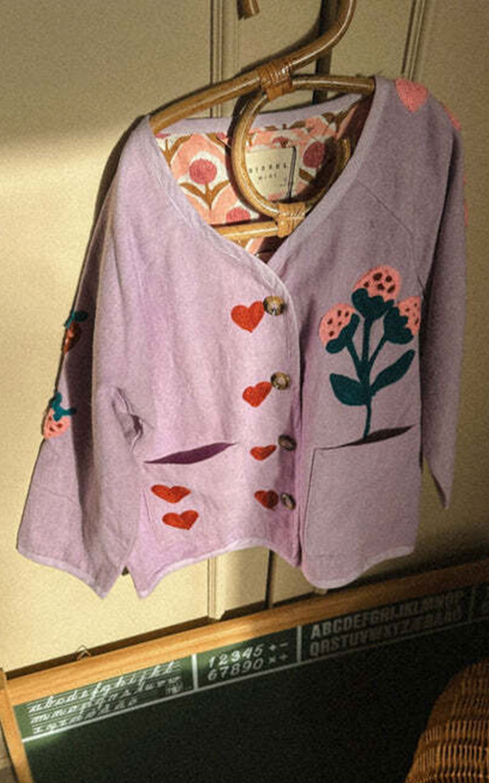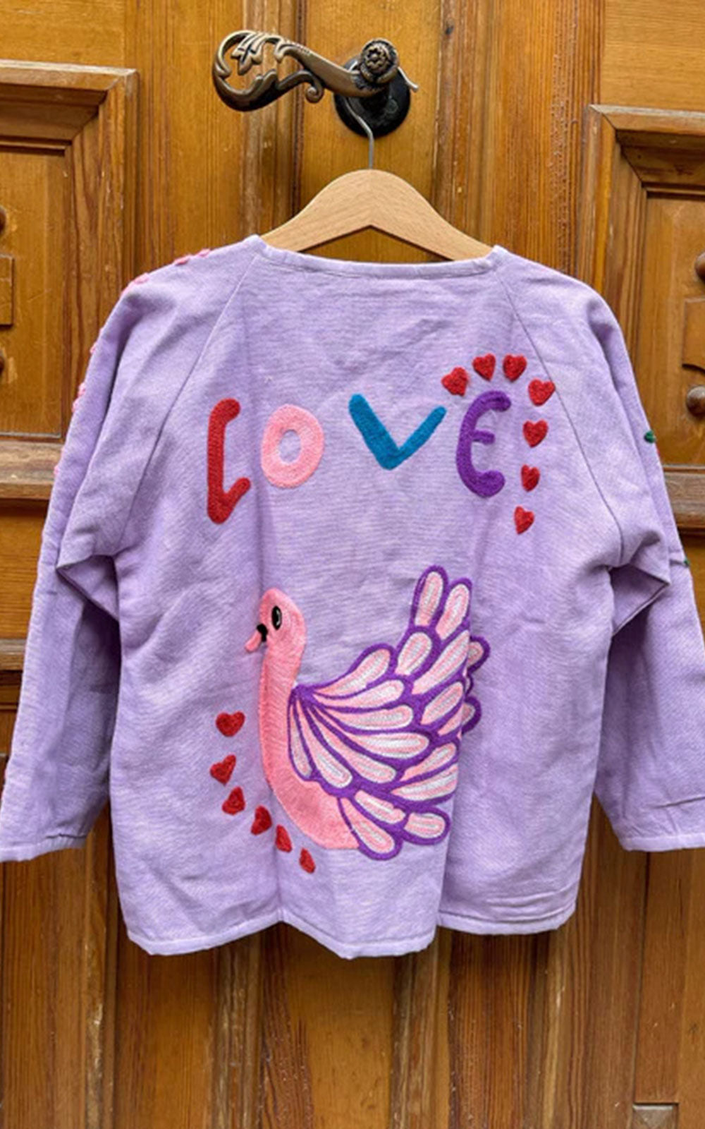 The Vega jacket features raglan sleeves and is decorated with a beautiful suzani embroidery with the "hearts & LOVE" design. The jacket has two front pockets and buttons on the front placket. All edges are covered with matching cotton ribbons and the jacket is fully lined with block printed cotton lining.