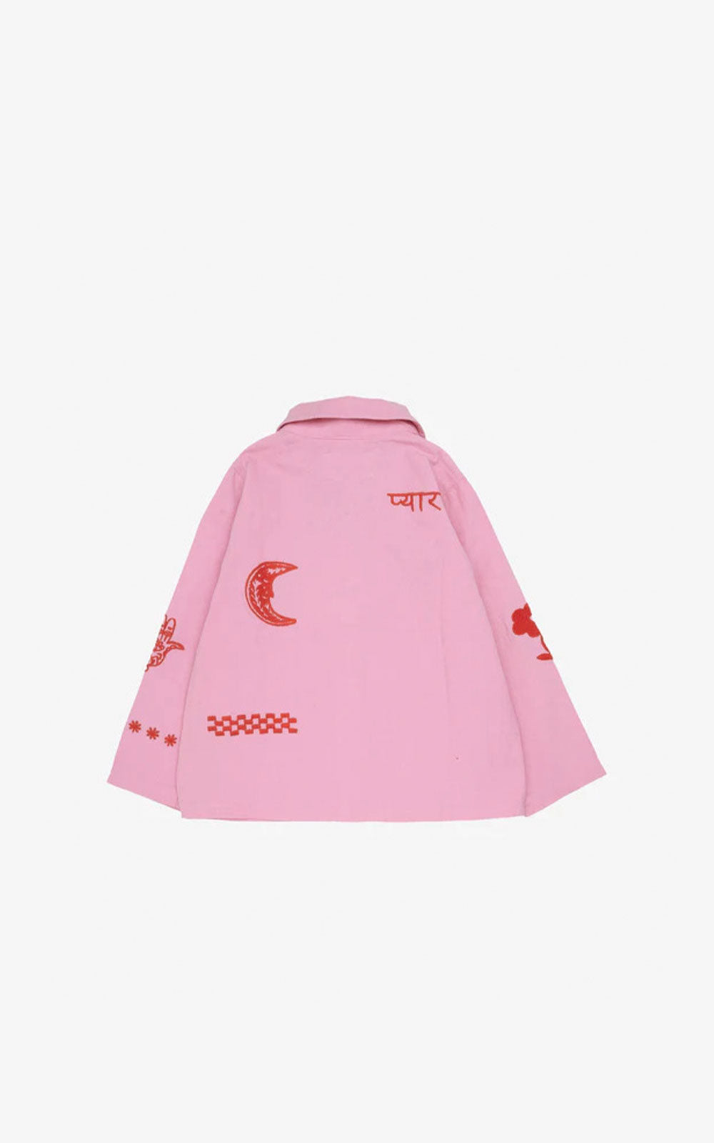 Mini organic cotton jacket with a casual cut. The jacket has a small shirt collar and long sleeves. On the front it has two pockets and on the placket there are buttons. It is decorated with various cute embroidered motifs: a leopard, pea pods, cherries, flowers and many other adorable motifs.