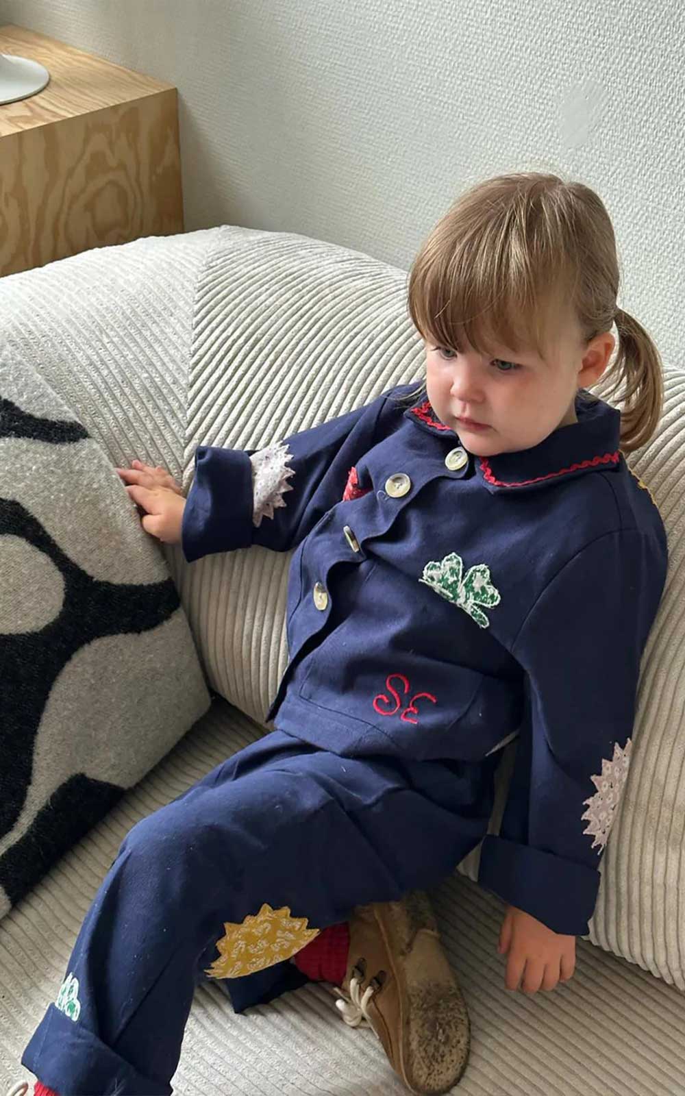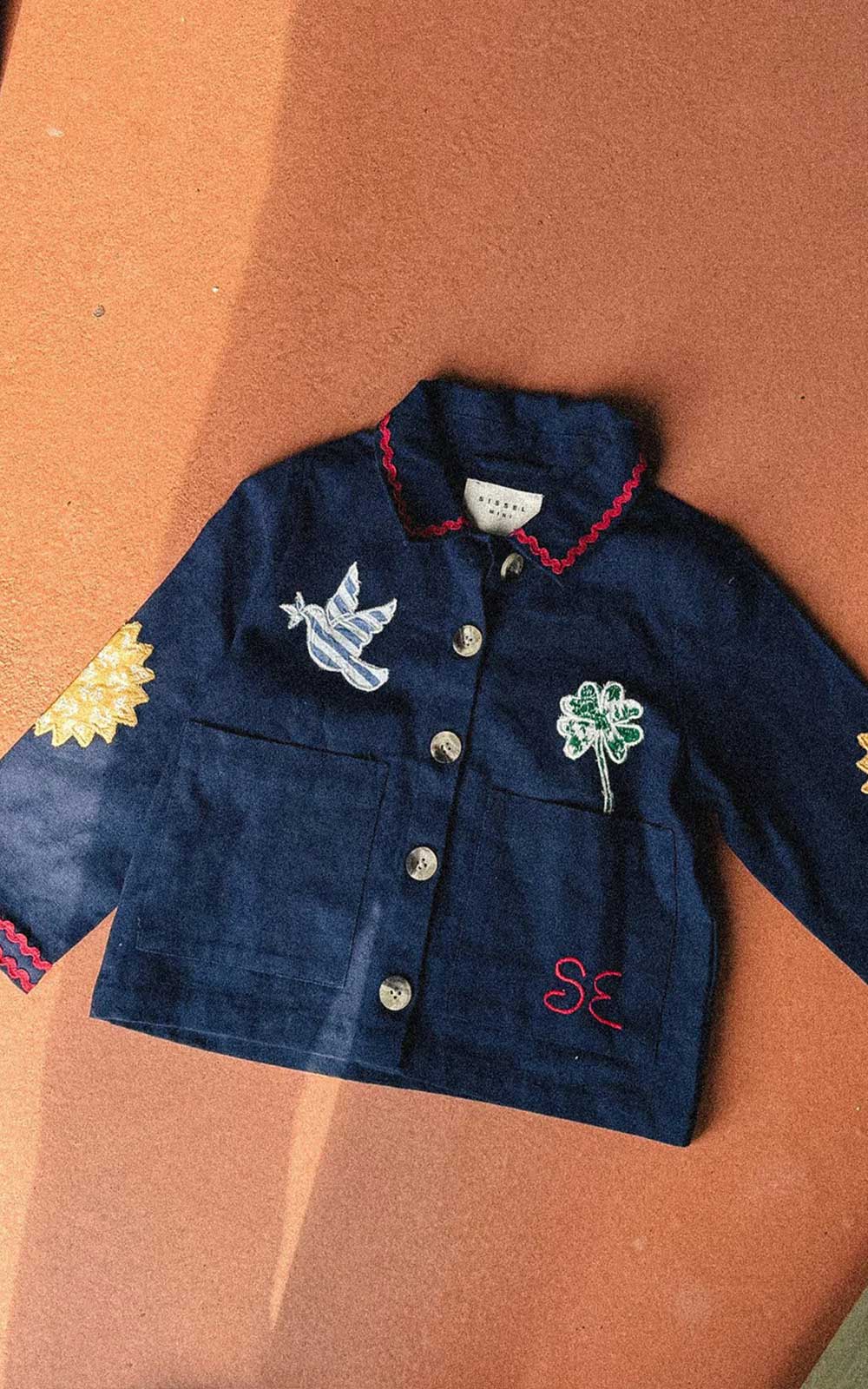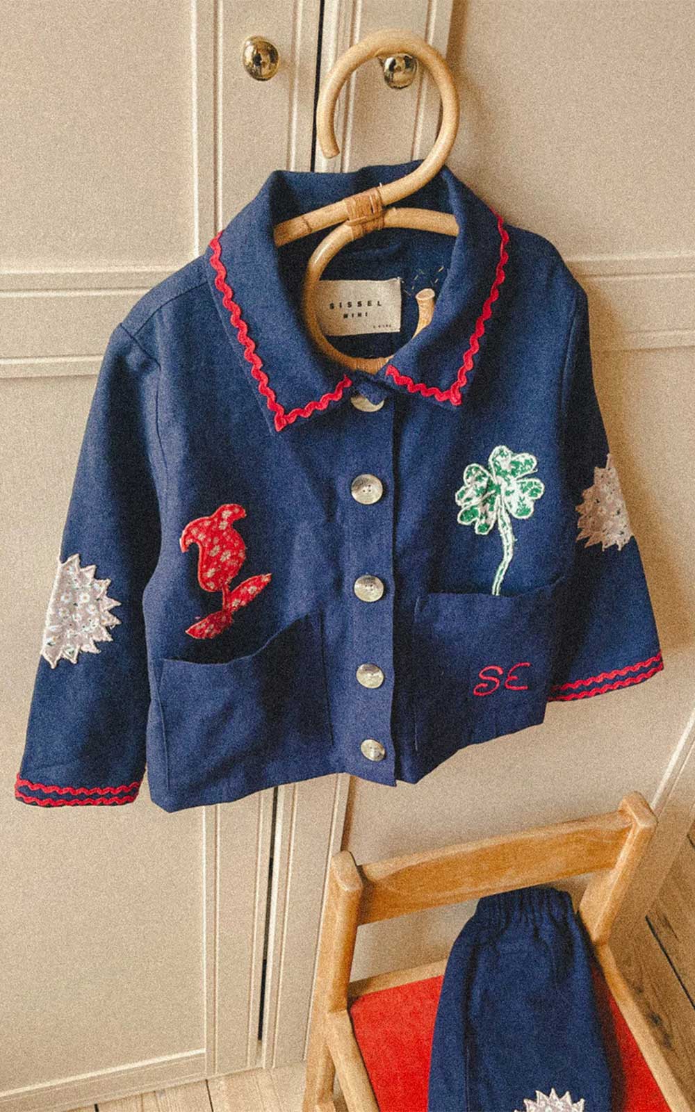 The jacket is made of 100% organic cotton and is beautifully decorated with appliqués made from leftover materials, featuring flowers, four-leaf clovers, and other charming motifs on the chest, pockets, and back.