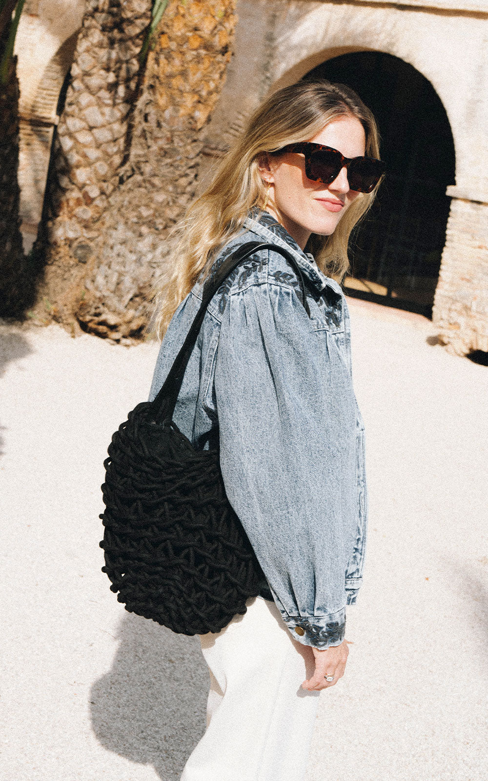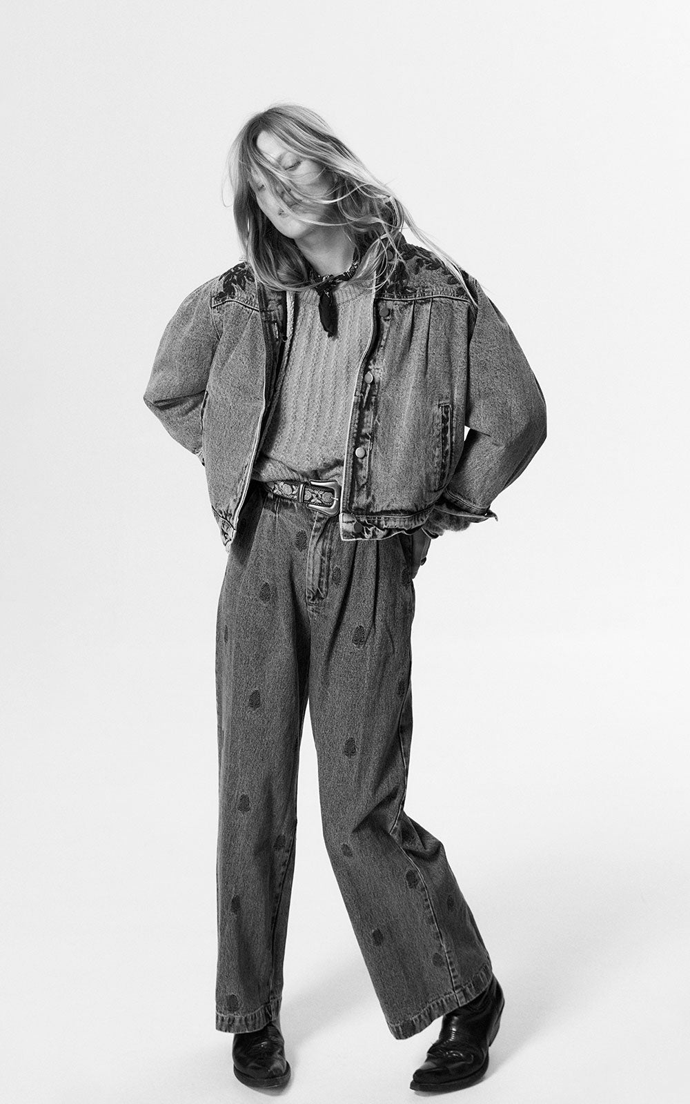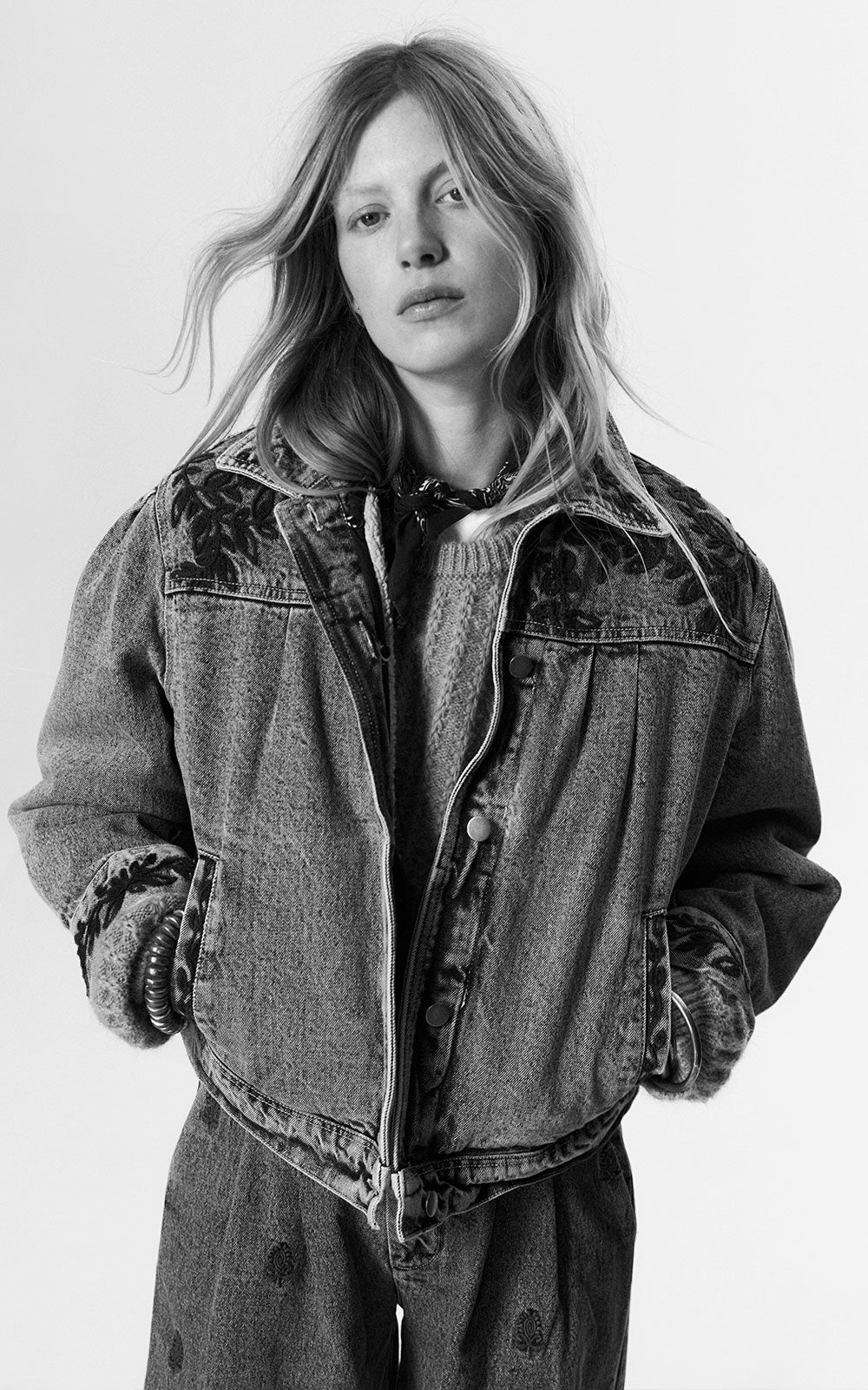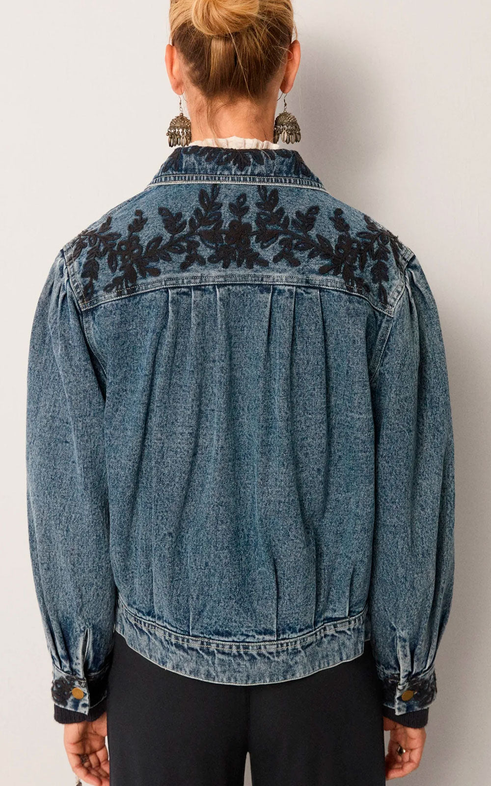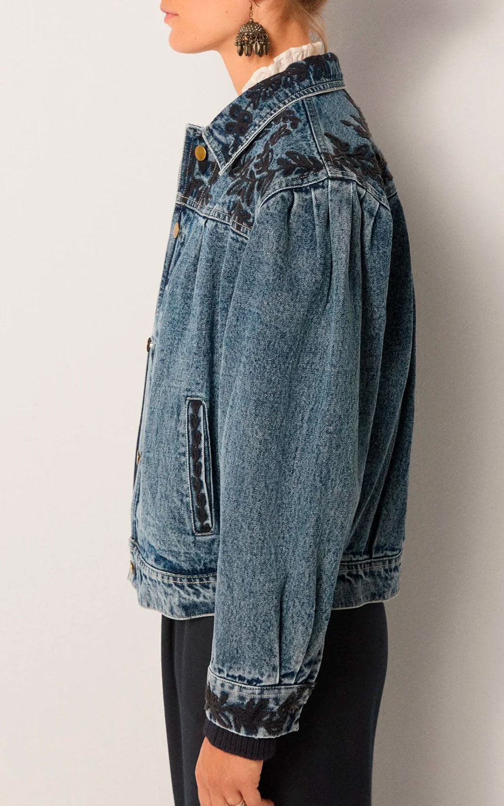 Sobre los hombros y puños se extienden bordados florales en índigo, desvaídos como sombras grabadas en la tela, que suavizan la estructura del denim y aportan un matiz artesanal. El resultado es una chaqueta con personalidad, expresiva y versátil.