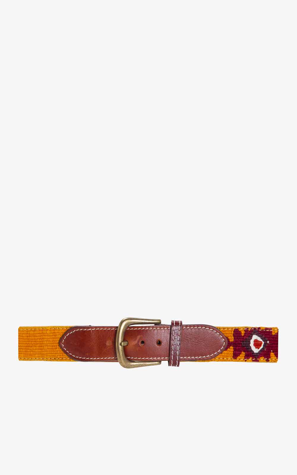 Children's belt made with ethnic ribbons of cotton threads and cow leather. The buckle is made of old gold metal. The width of the belt is 3 cm.