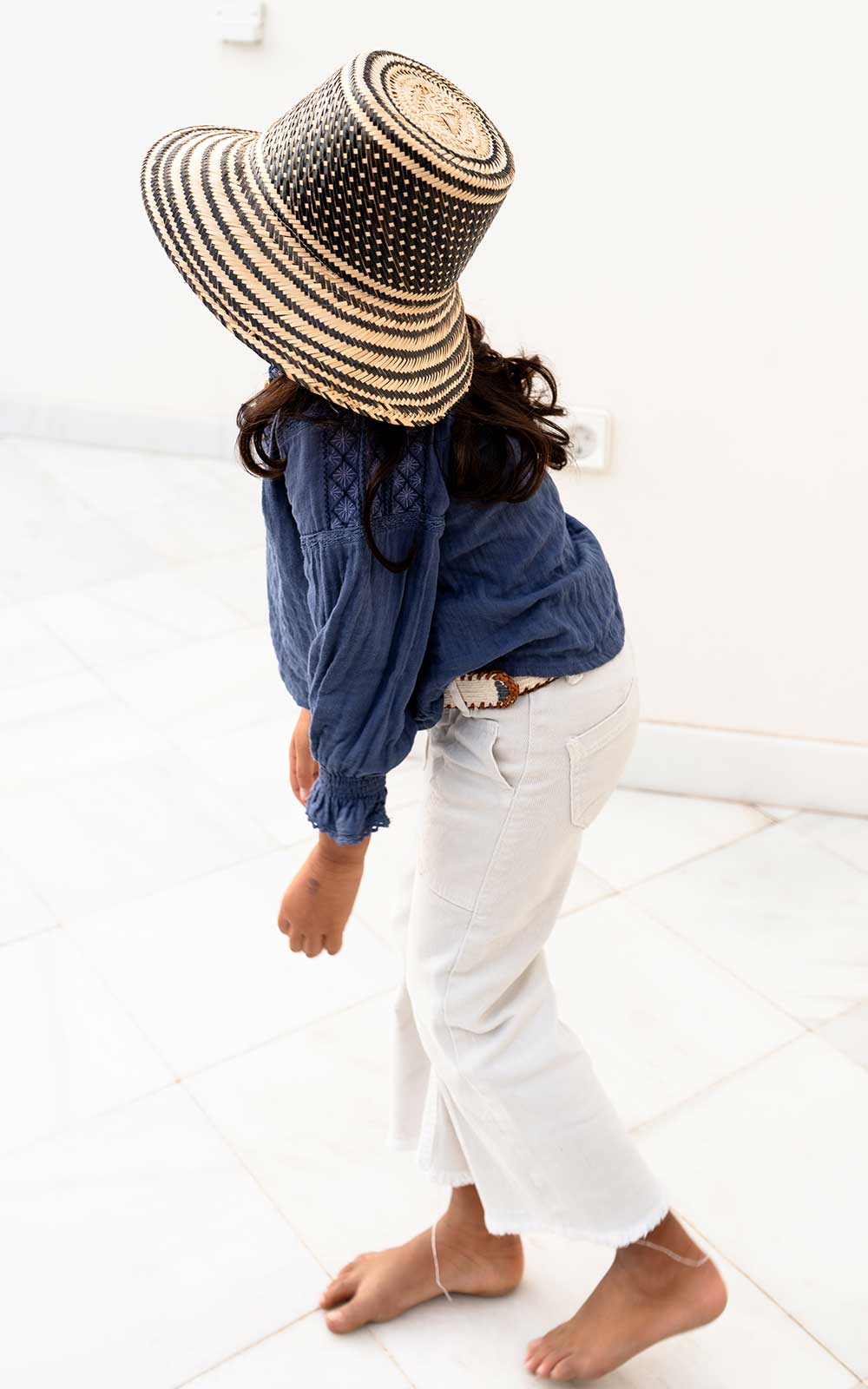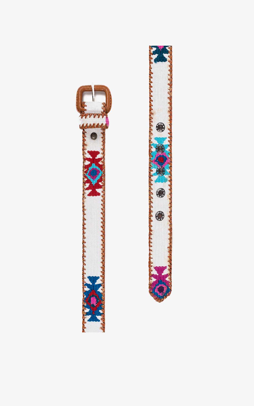 Leather-based belts with ethnic decorations of different colors braided with cotton threads. The ethnic rhombuses of different colors are hand-woven (*). The metal buckle is covered in leather.