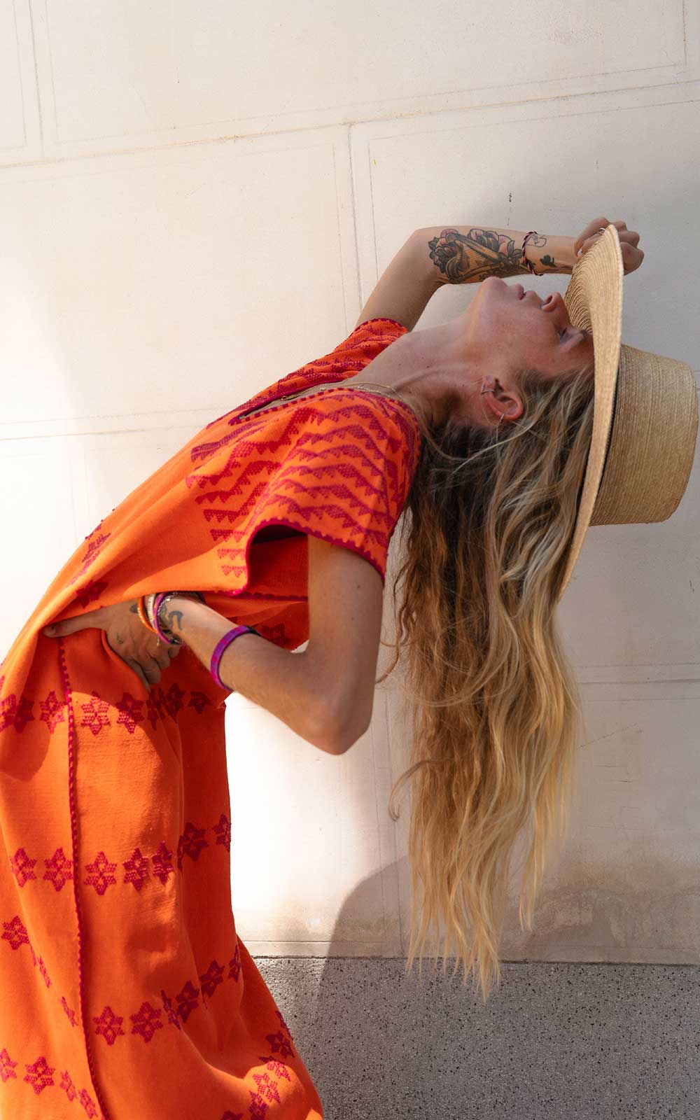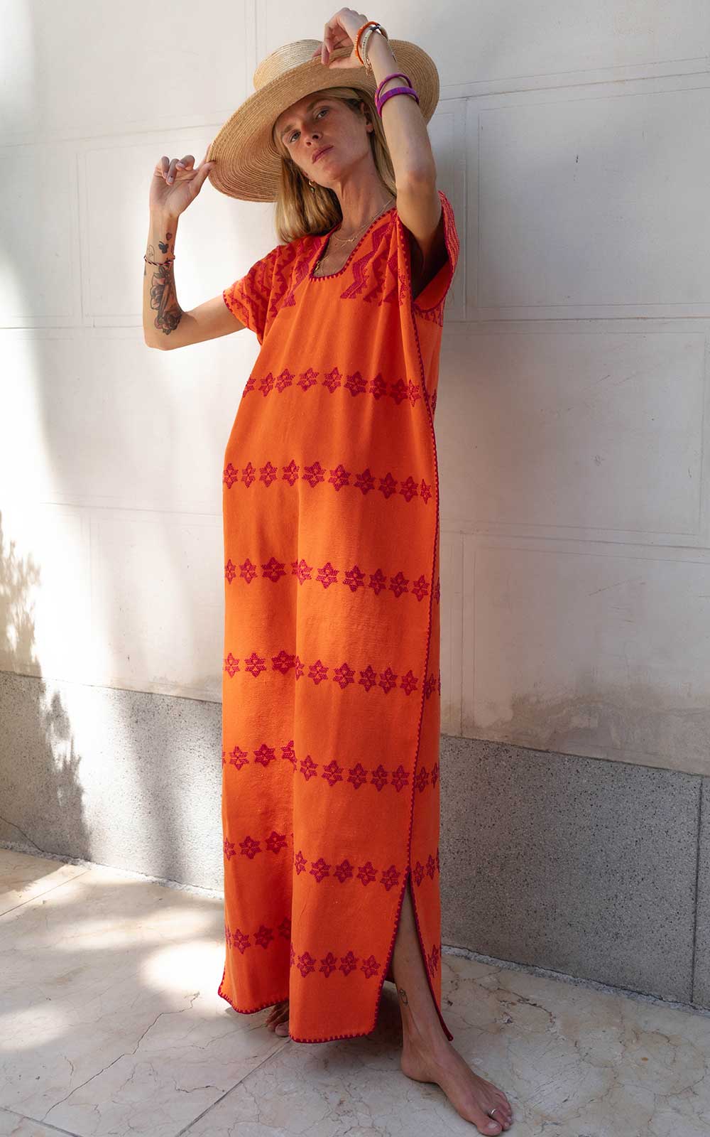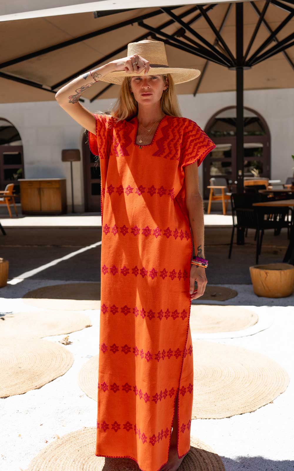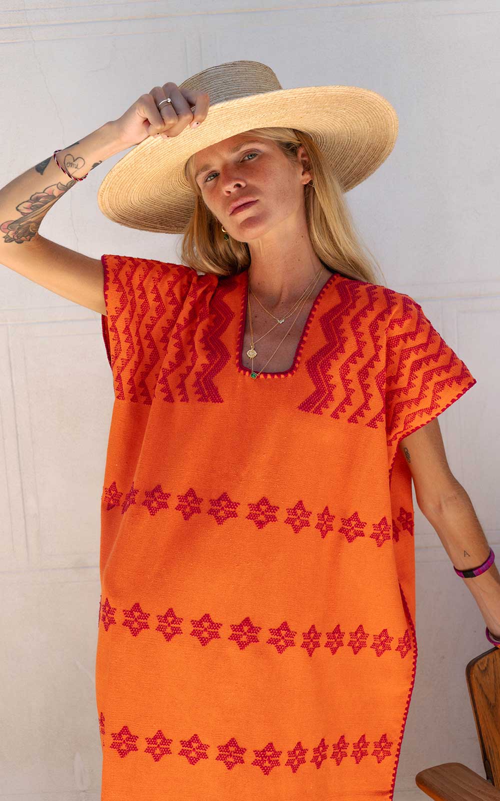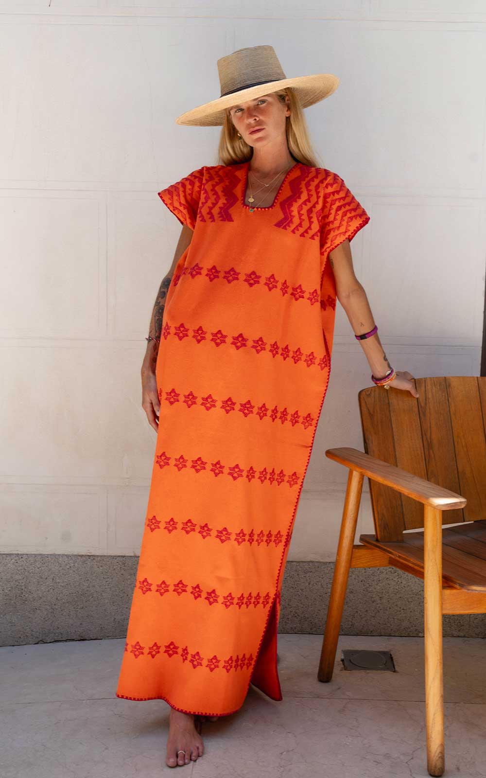 This single-panel maxi dress, an icon of traditional Oaxacan dress, has won over fashion editors around the world for its timeless silhouette and authentic character. In this edition, we've subtly lengthened the pattern to stylize the figure and provide a more elegant and flattering drape.