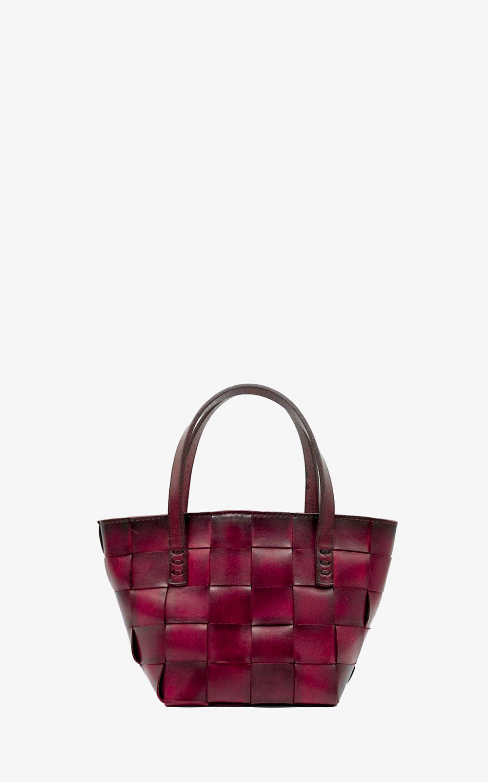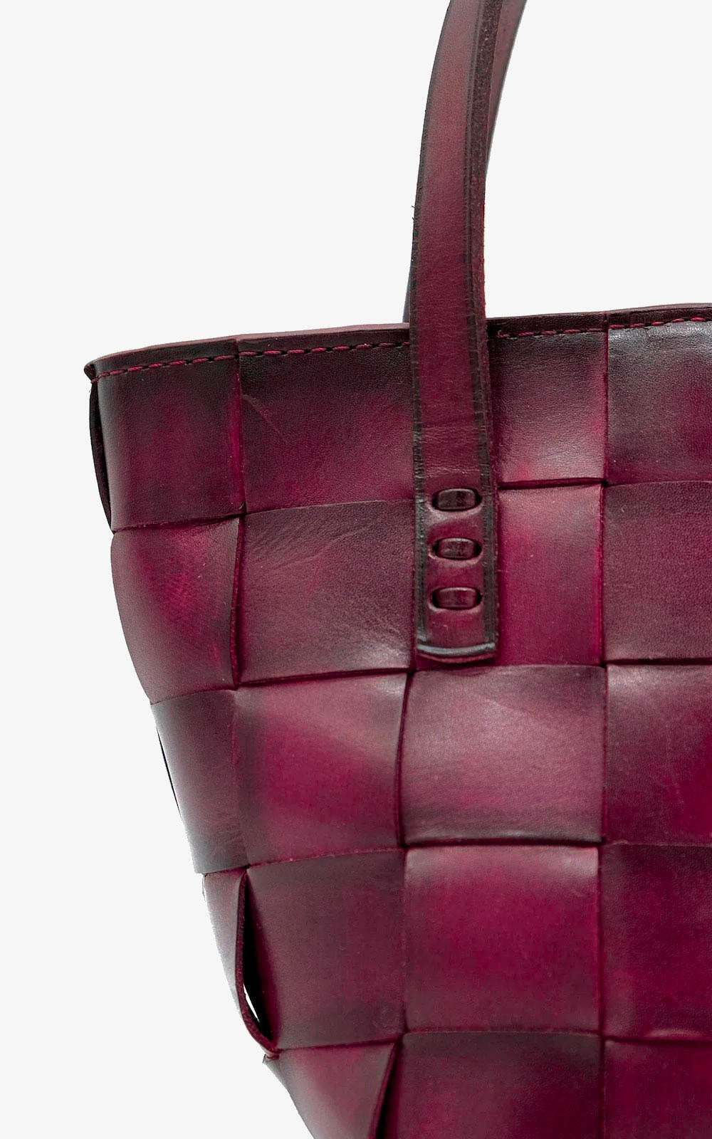 El bolso Japan Mini en tono burdeos es una reinterpretación del clásico Japan Tote de Dragon Diffusion, manteniendo su esencia artesanal en un formato más ligero y urbano. Tejido a mano en piel de vacuno suave, este modelo presenta un diseño de tiras cruzadas que combina técnica tradicional con una estética contemporánea.