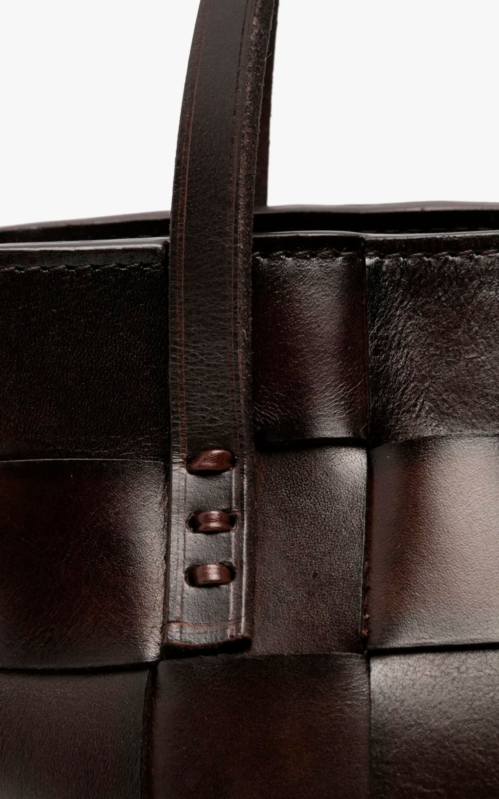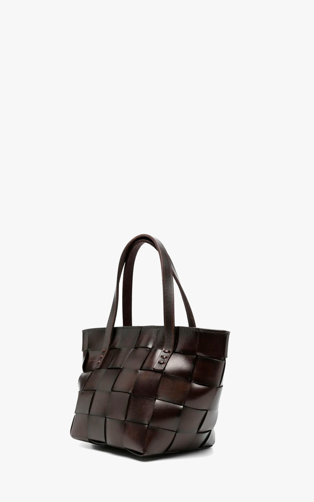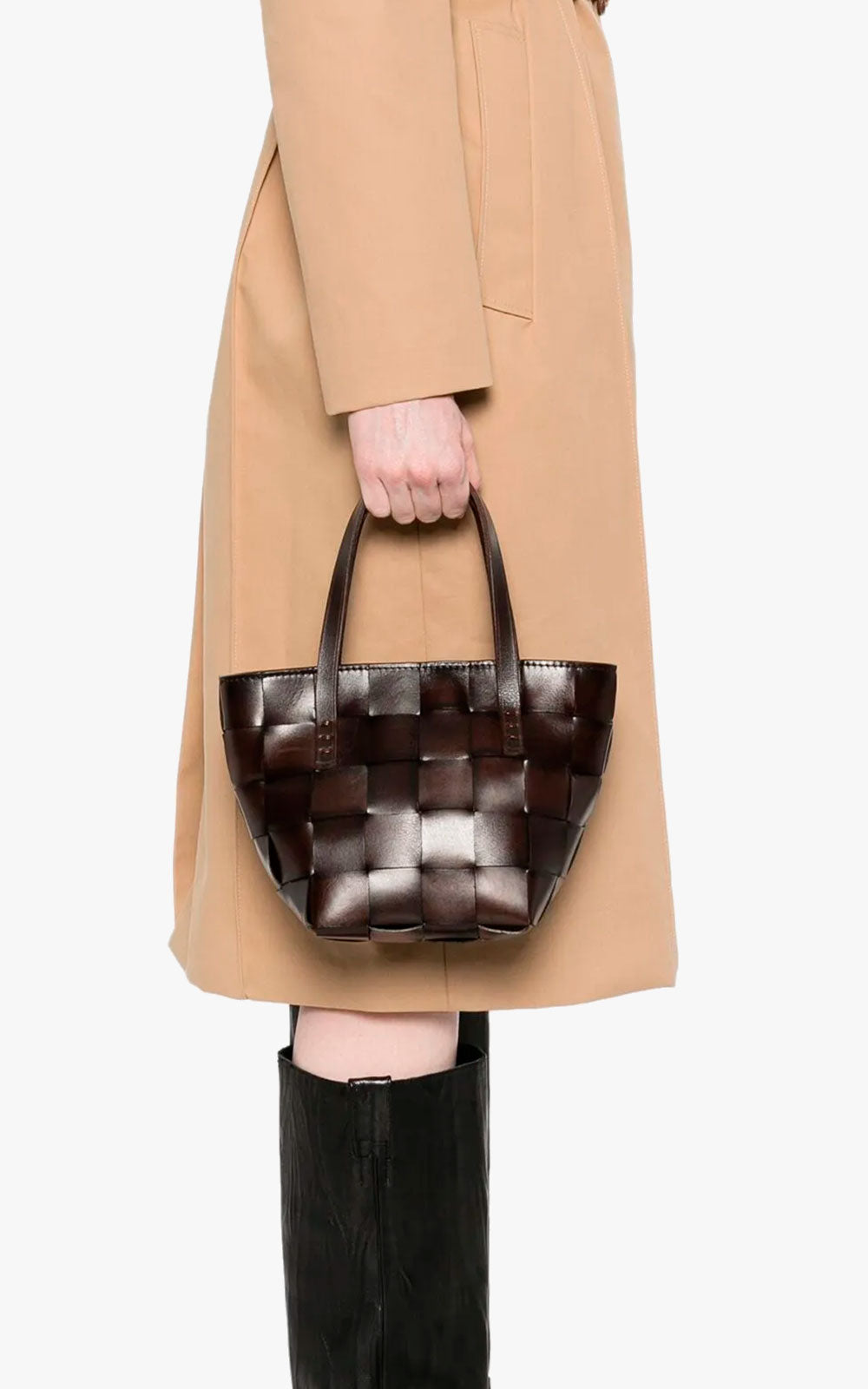 El bolso Japan Mini en tono burdeos es una reinterpretación del clásico Japan Tote de Dragon Diffusion, manteniendo su esencia artesanal en un formato más ligero y urbano. Tejido a mano en piel de vacuno suave, este modelo presenta un diseño de tiras cruzadas que combina técnica tradicional con una estética contemporánea.