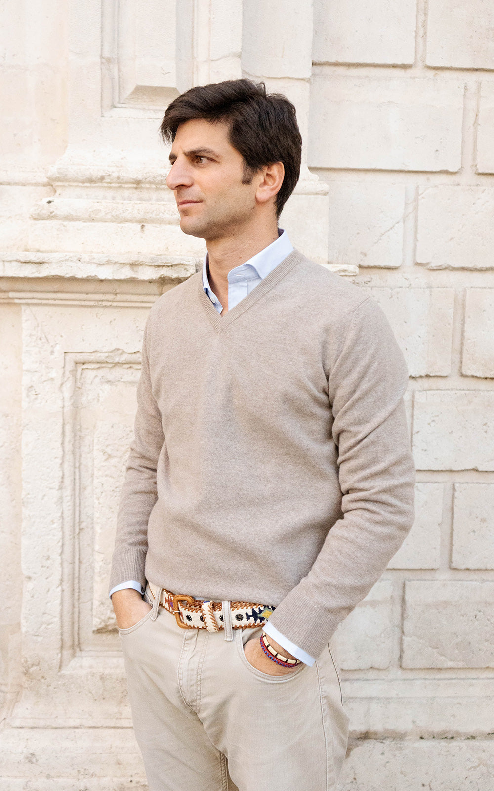 V-neck sweater knitted with 100% cashmere for maximum feel and quality. Dry clean in cold water.
