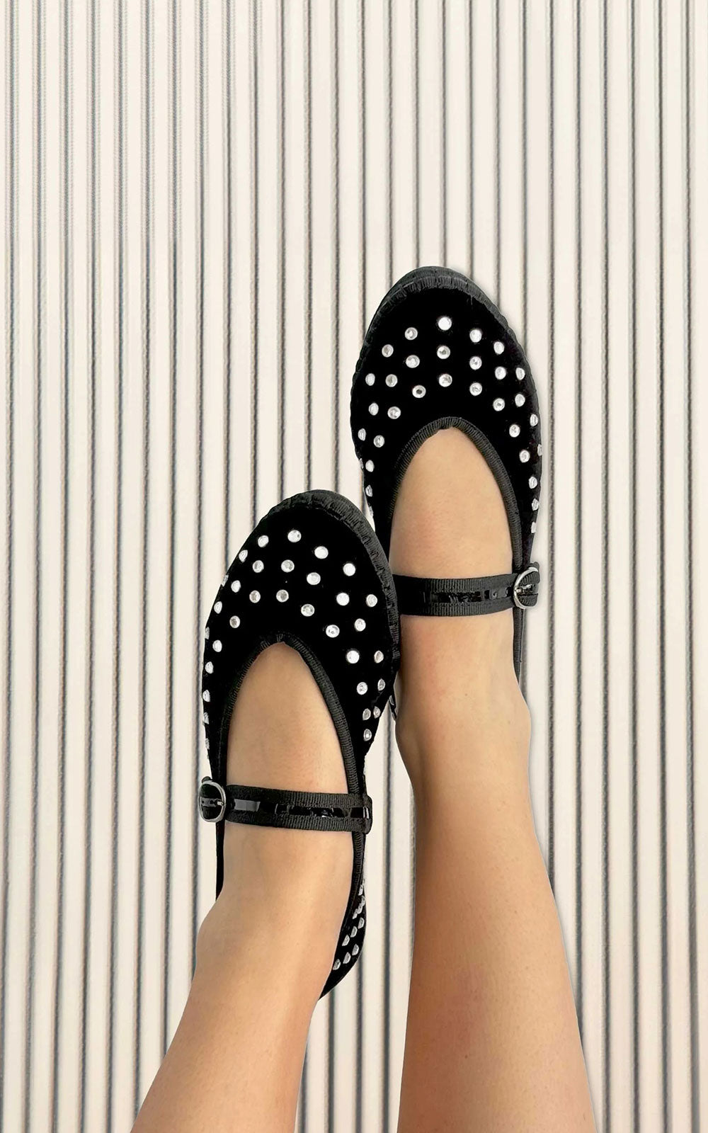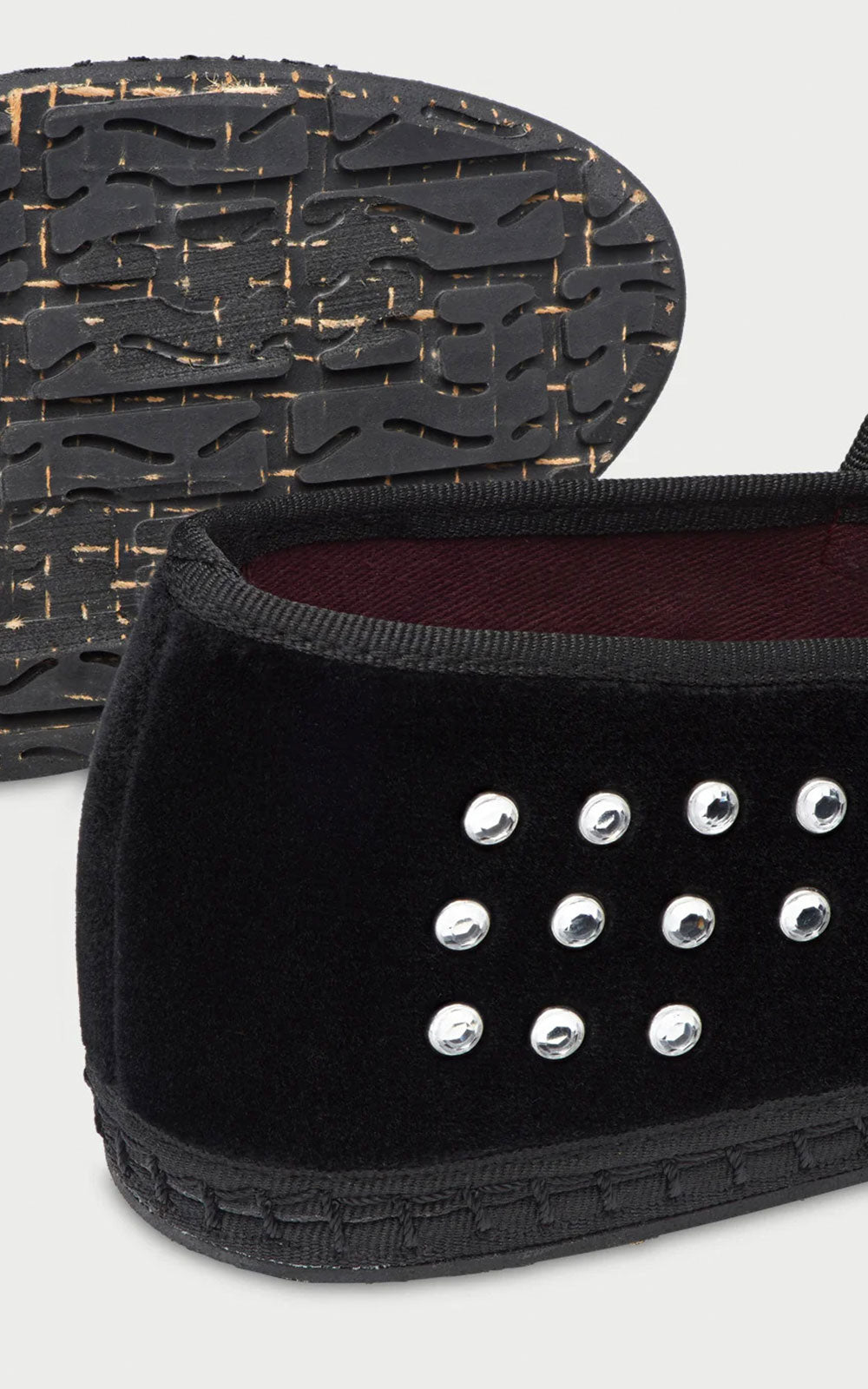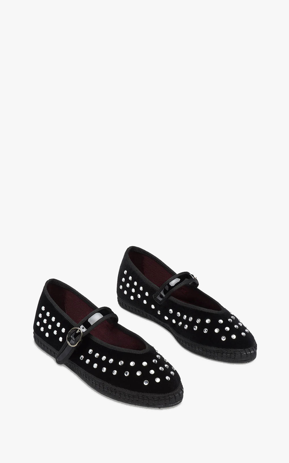 Velvet ballerina flat with mini crystal detailing all around with a V-neckline with contrasting trim. Lace up with a patent leather strap and buckle fastening. The sole is made from rubber produced from recycled bicycle tyres.