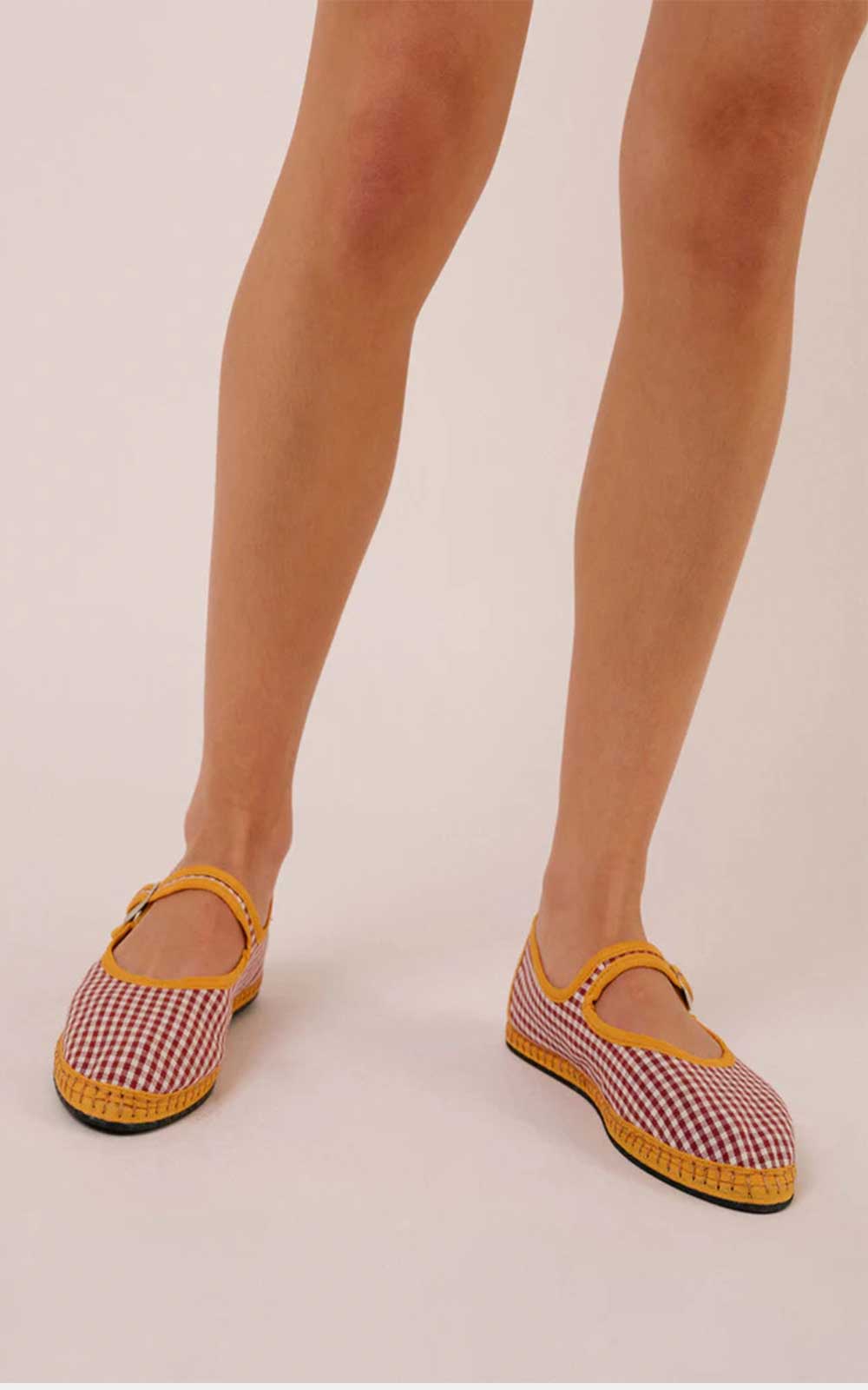 Cotton Maryjane style shoe with colored trim. Design by the Spanish firm Sveti Stefan