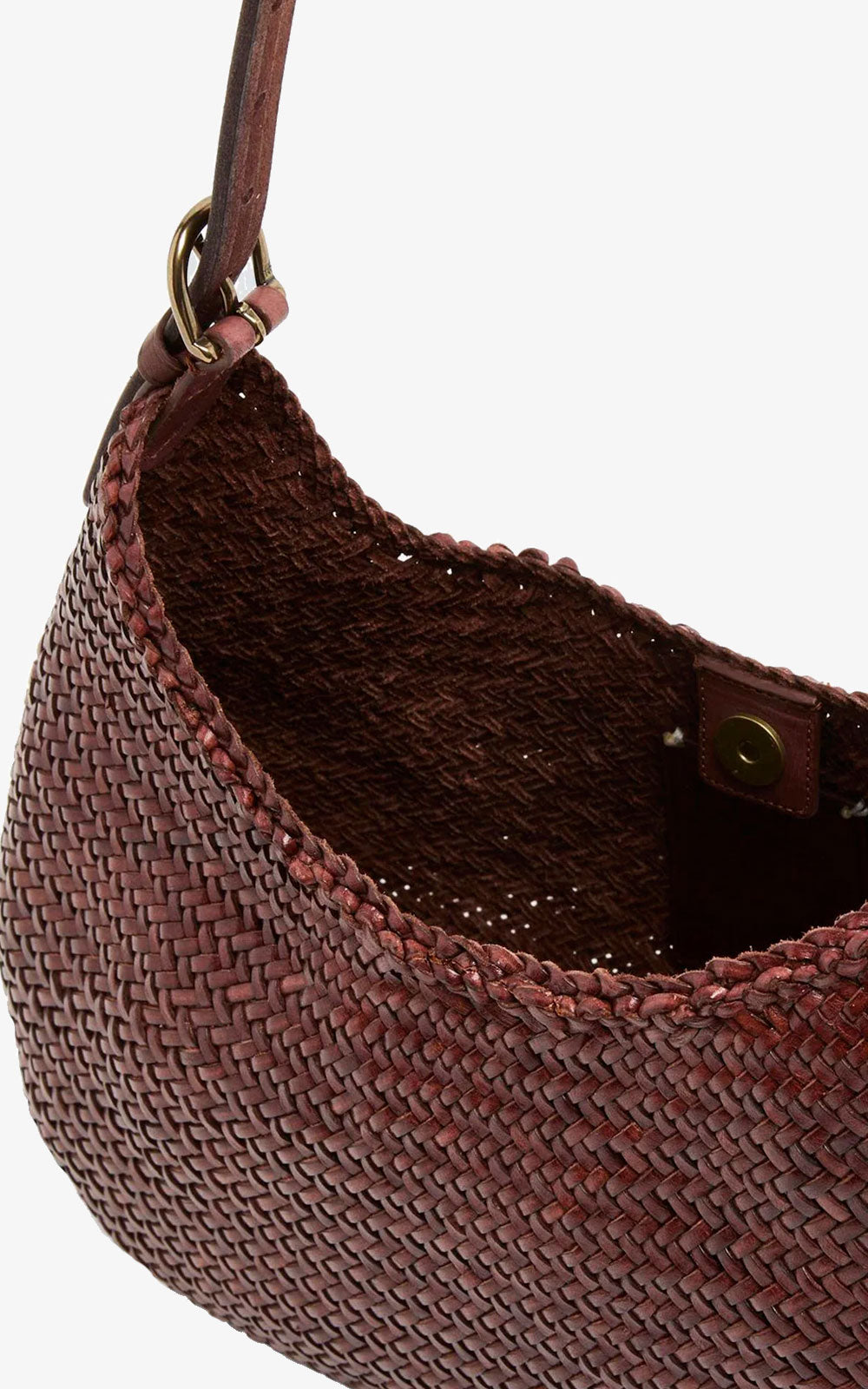Su forma semicircular envuelve el cuerpo con fluidez, mientras su asa ajustable de piel lisa permite llevarlo cómodamente al hombro. El color bruciato, un marrón con reflejos cobrizos, aporta una calidez luminosa que resalta la riqueza del cuero y lo convierte en una pieza ideal para cualquier estación.