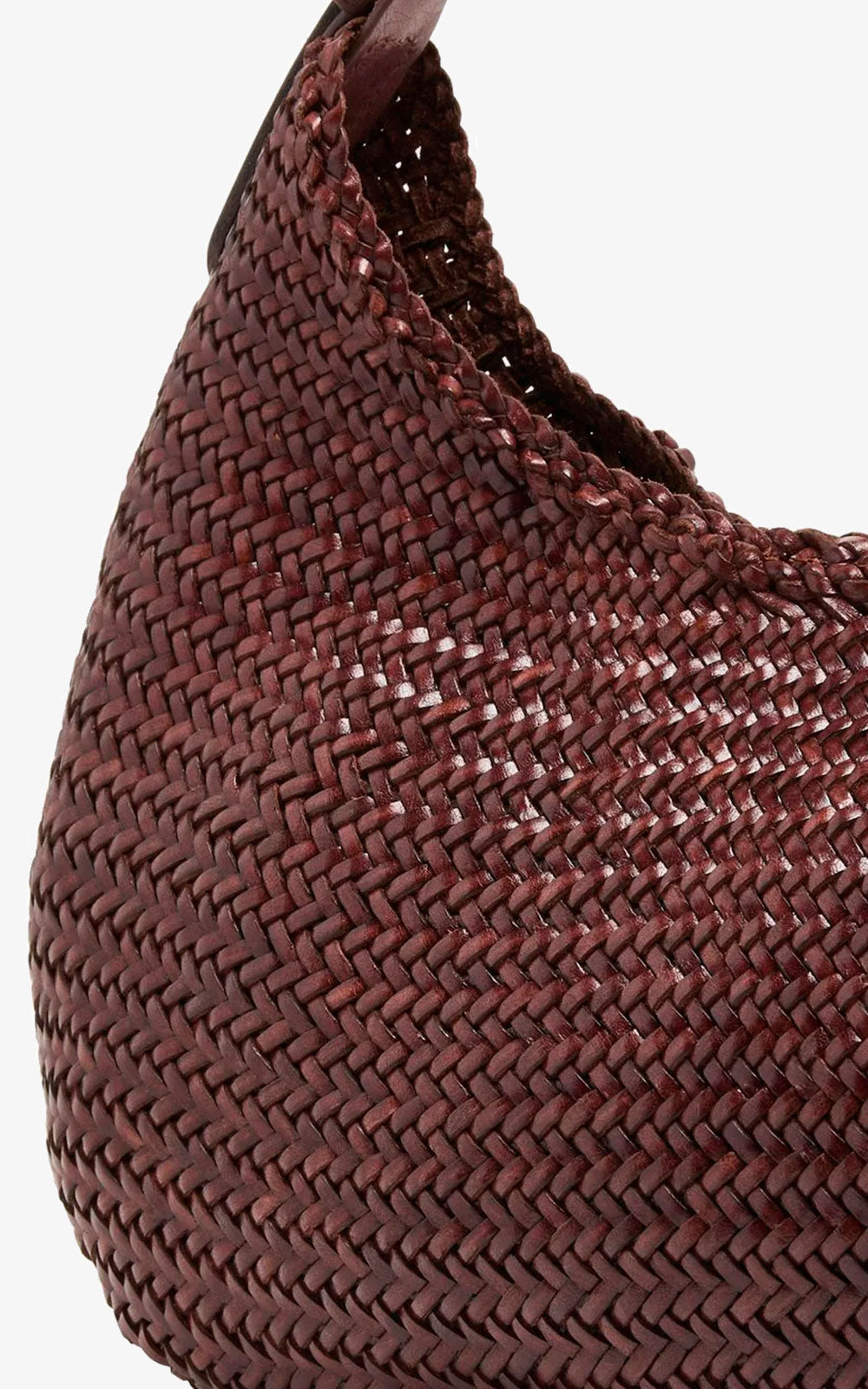 Bolso tejido completamente a mano con tiras de piel de ternera búfala, este bolso mediano equilibra a la perfección espacio, ligereza y estilo.