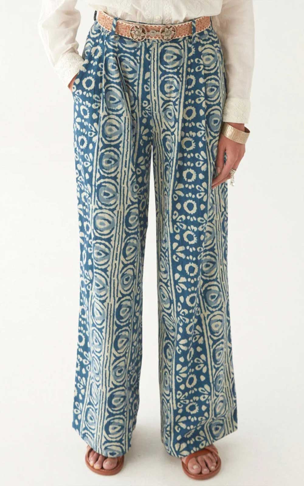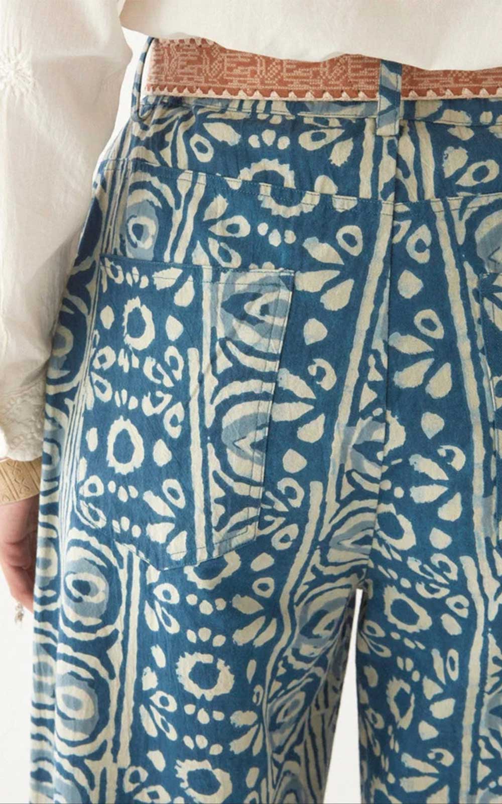 Indigo-dyed cotton trousers with a rich, abstract yet structured print, featuring vertical motifs that create a striking sense of movement.