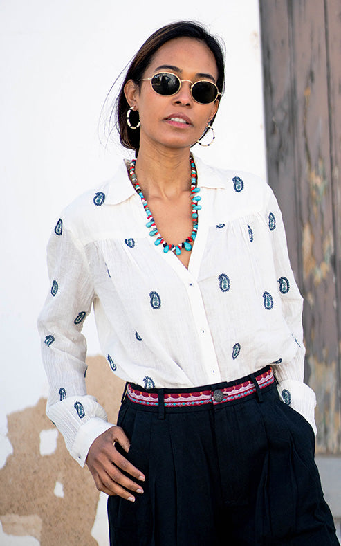 Trousers crafted from navy cotton with a raw, effortless drape. Subtle embroidered details add a subtle challenge: nothing strident, just enough to set them apart.