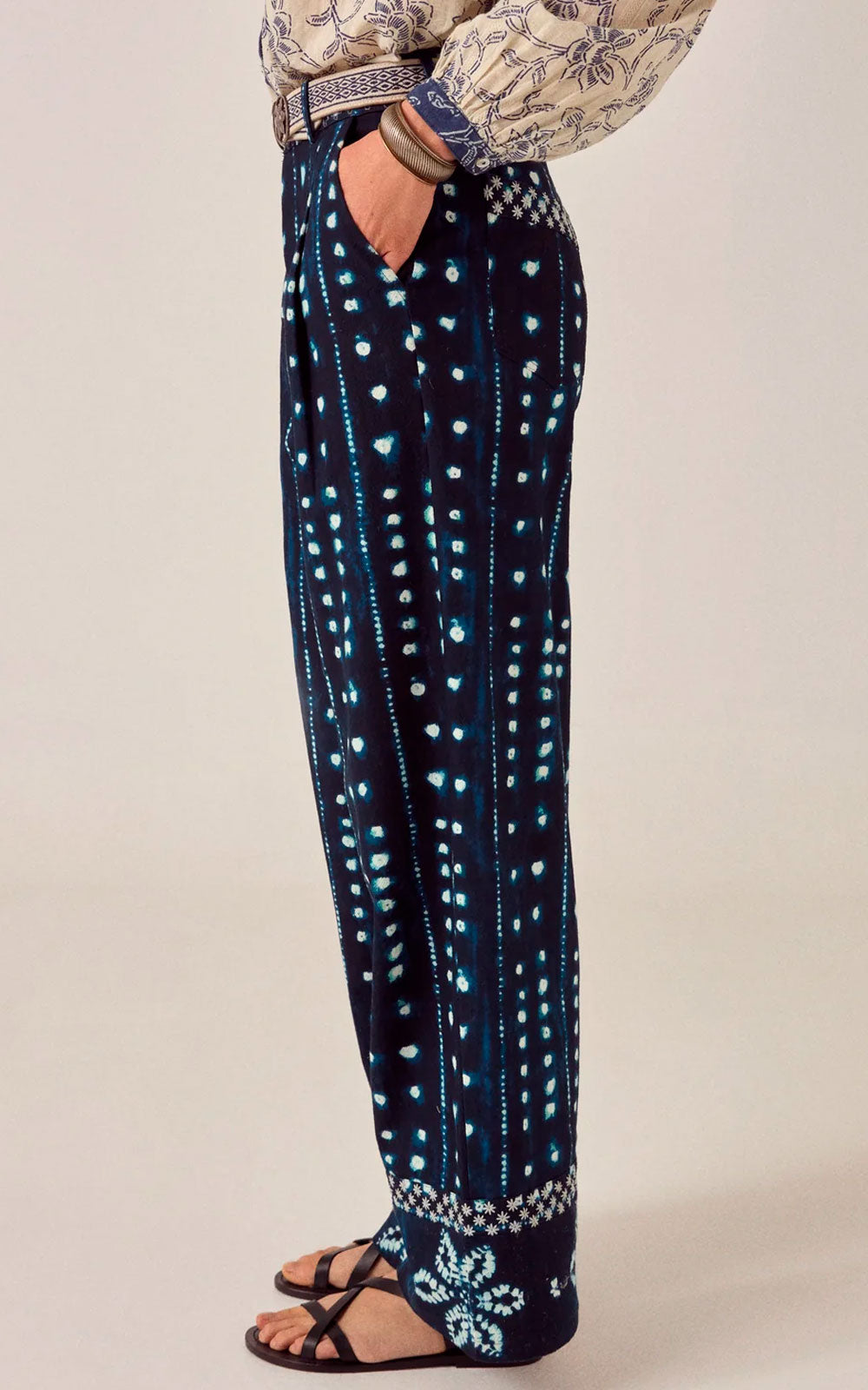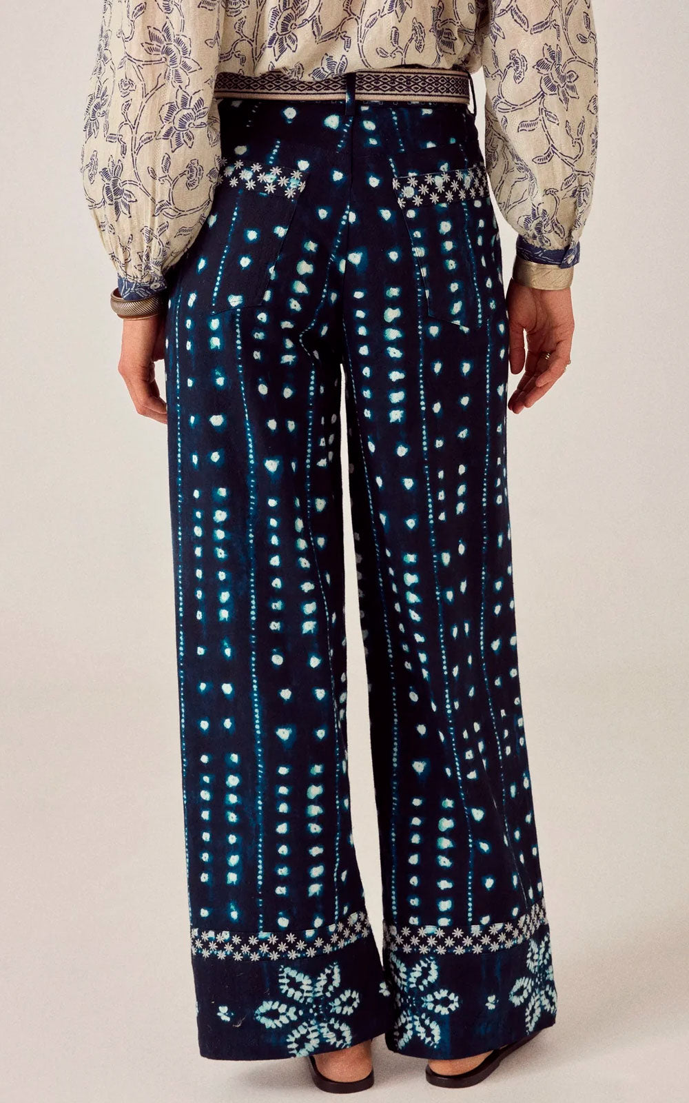 Wide-leg cotton trousers with a Japanese shibori-inspired print in midnight blue and sky blue tones.