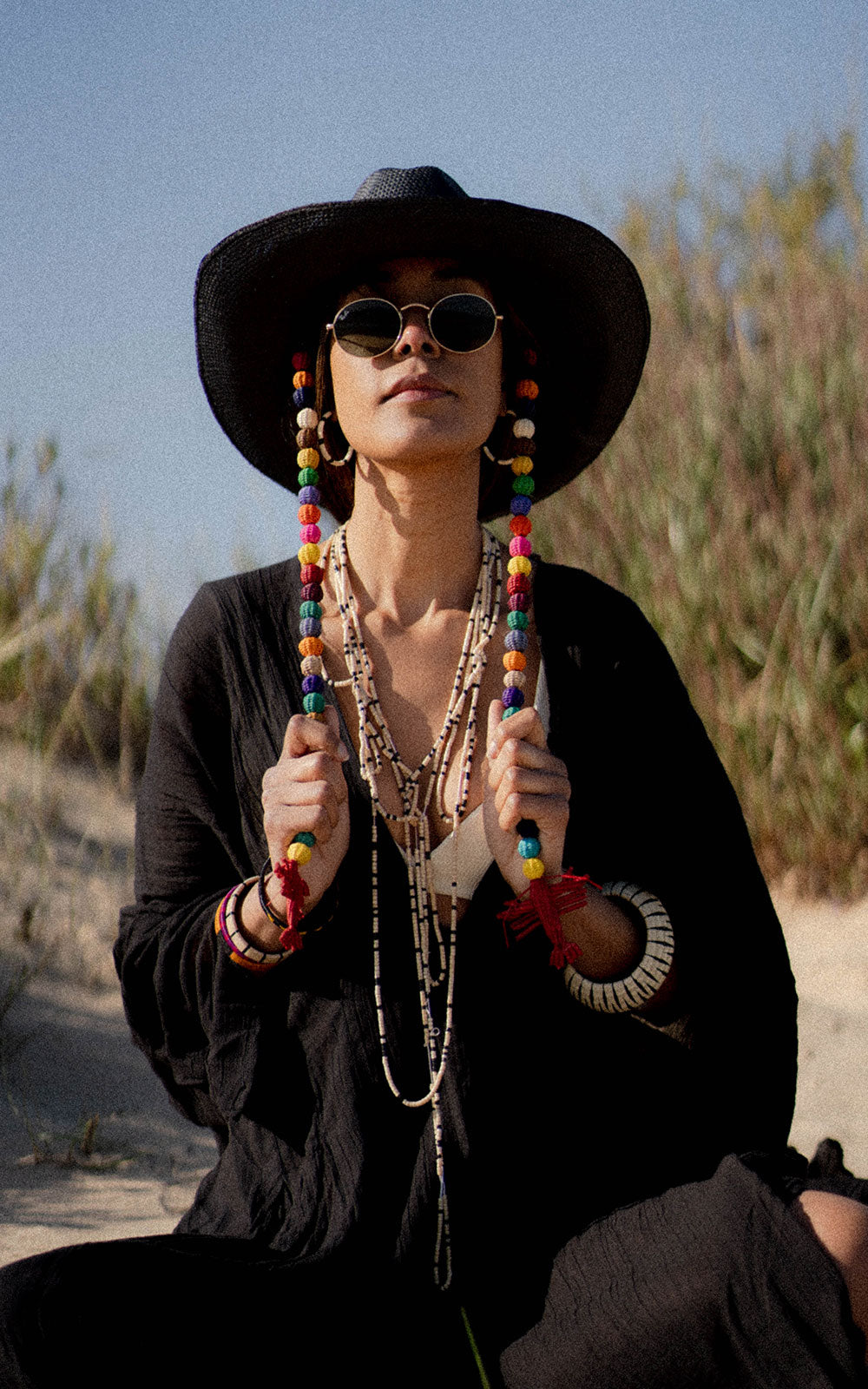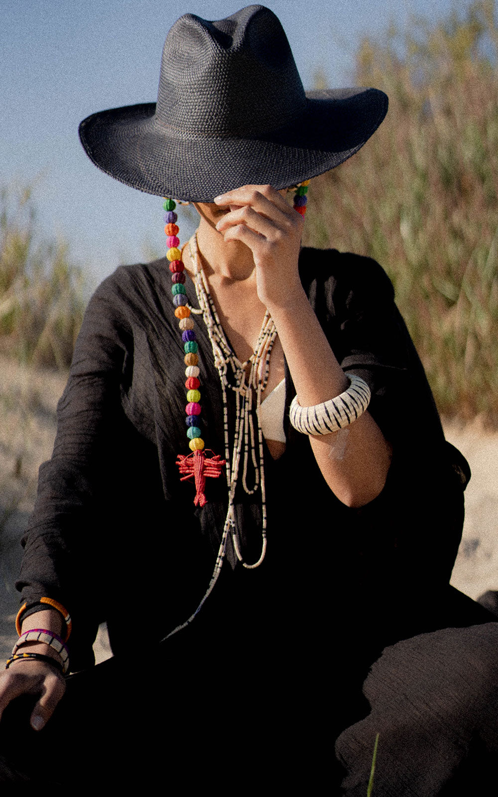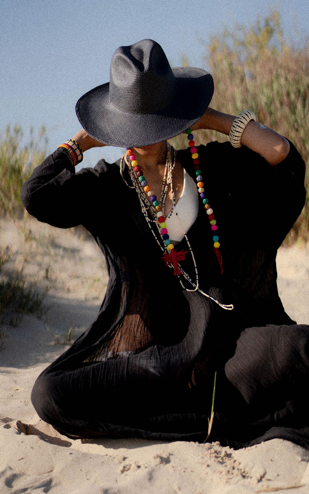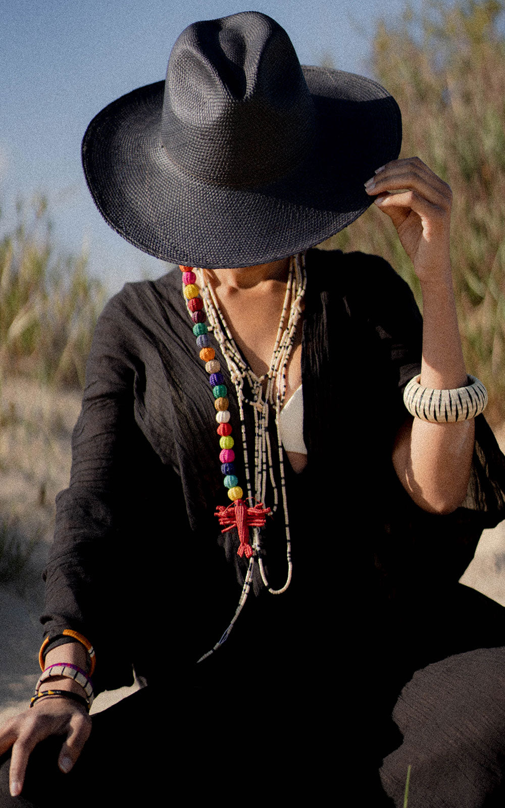 A hat handwoven from iraca palm by hands that understand the music of the Caribbean, this piece vibrates to the rhythm of its wearer. Dark as the night before the party. Light as an unexpected dance step. " Negro Carnaval" is a restrained celebration, a piece that hides its joy until movement awakens it.