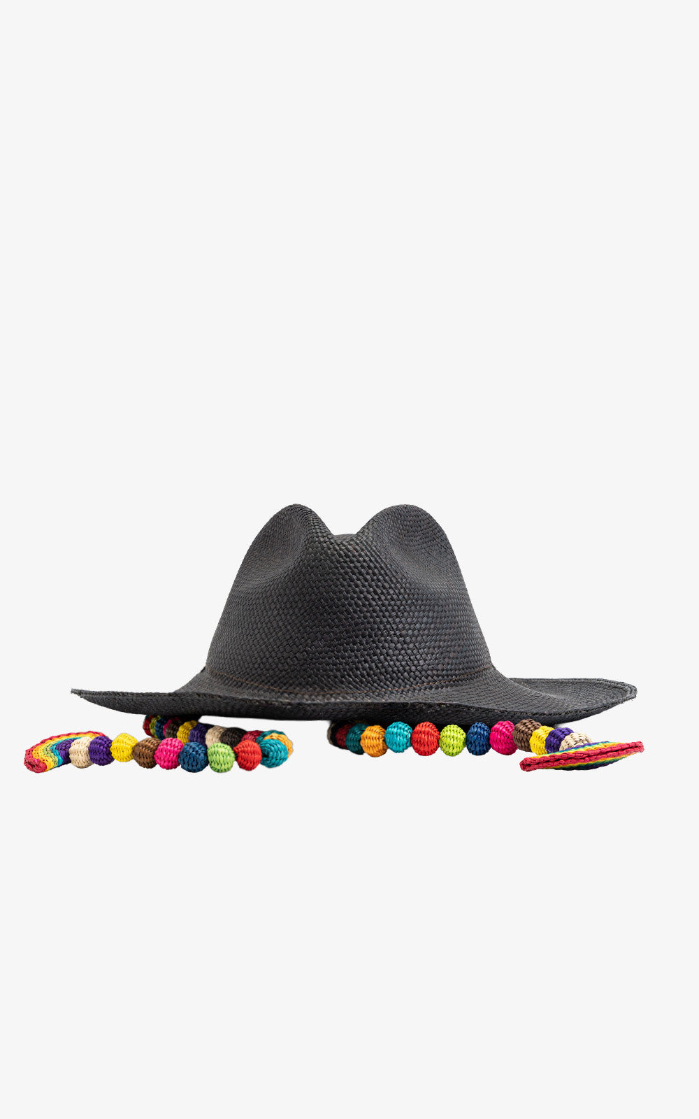 Two strings hang on either side like a gravity-defying streamer: hand-woven spheres in every imaginable color, topped by rainbows that don't ask permission to appear. It's a hat that transforms black into mystery, and color into gesture.