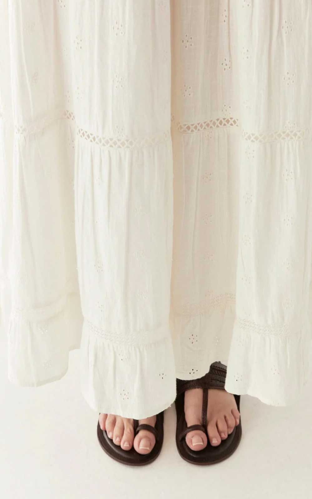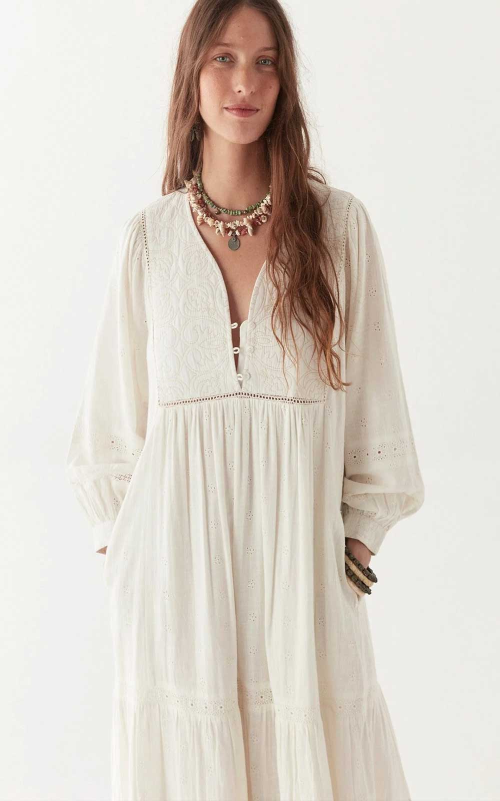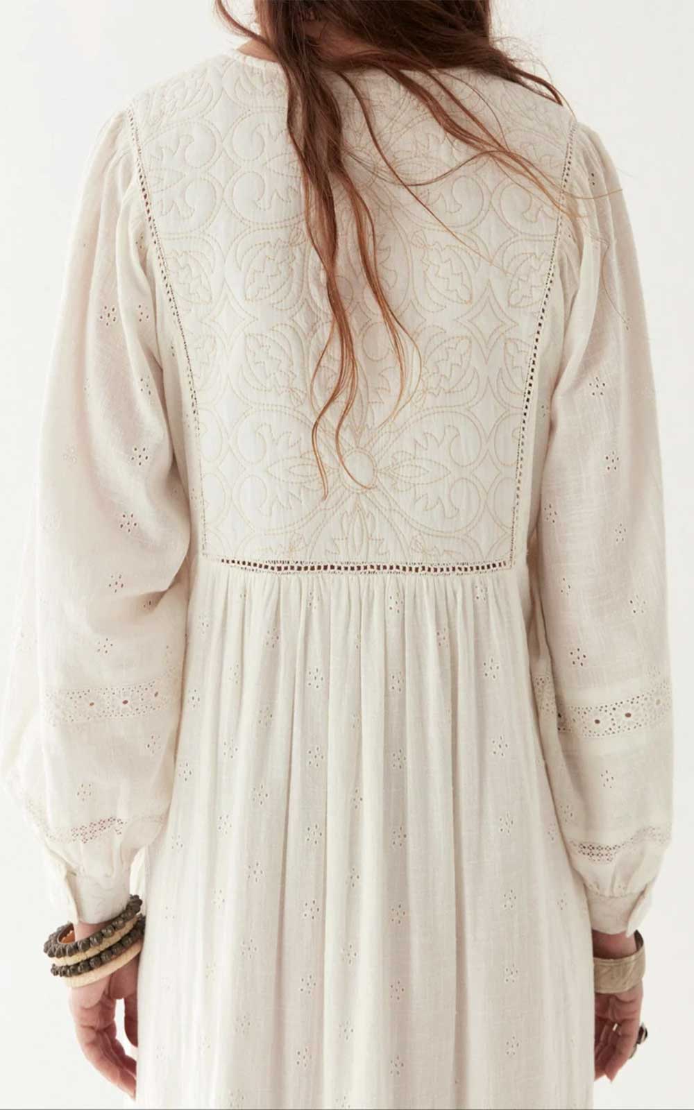 Loose-fitting, lightweight cotton dress with delicate broderie anglaise throughout. It features a bodice detail for structure.