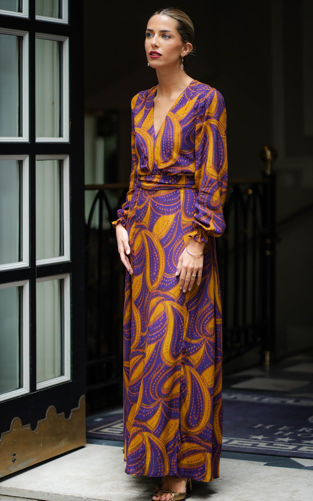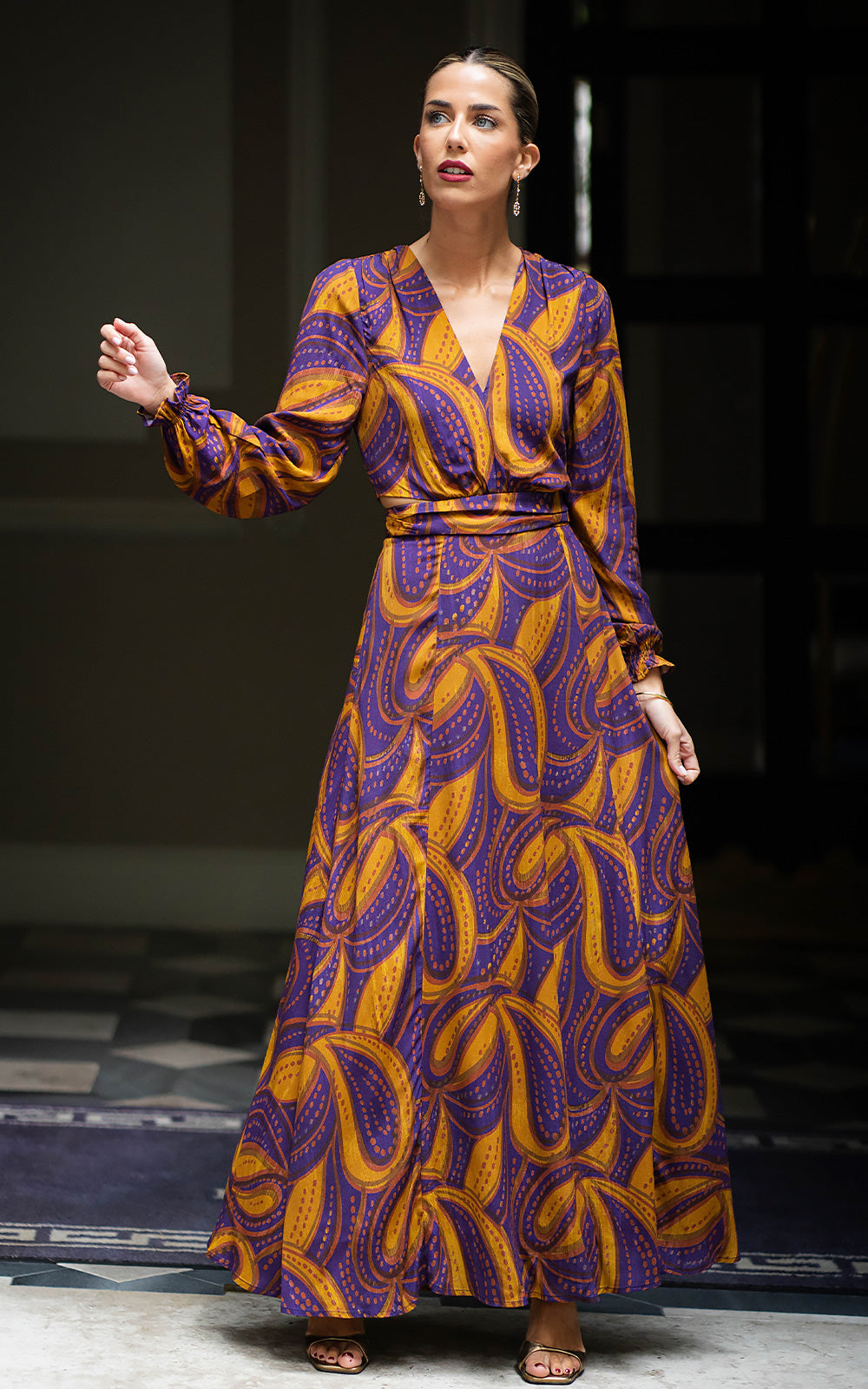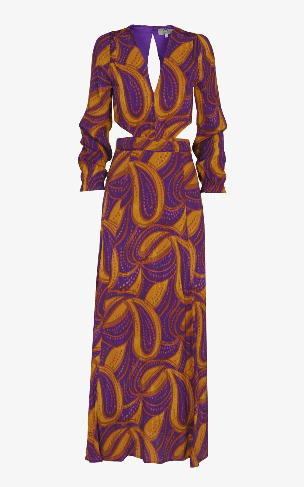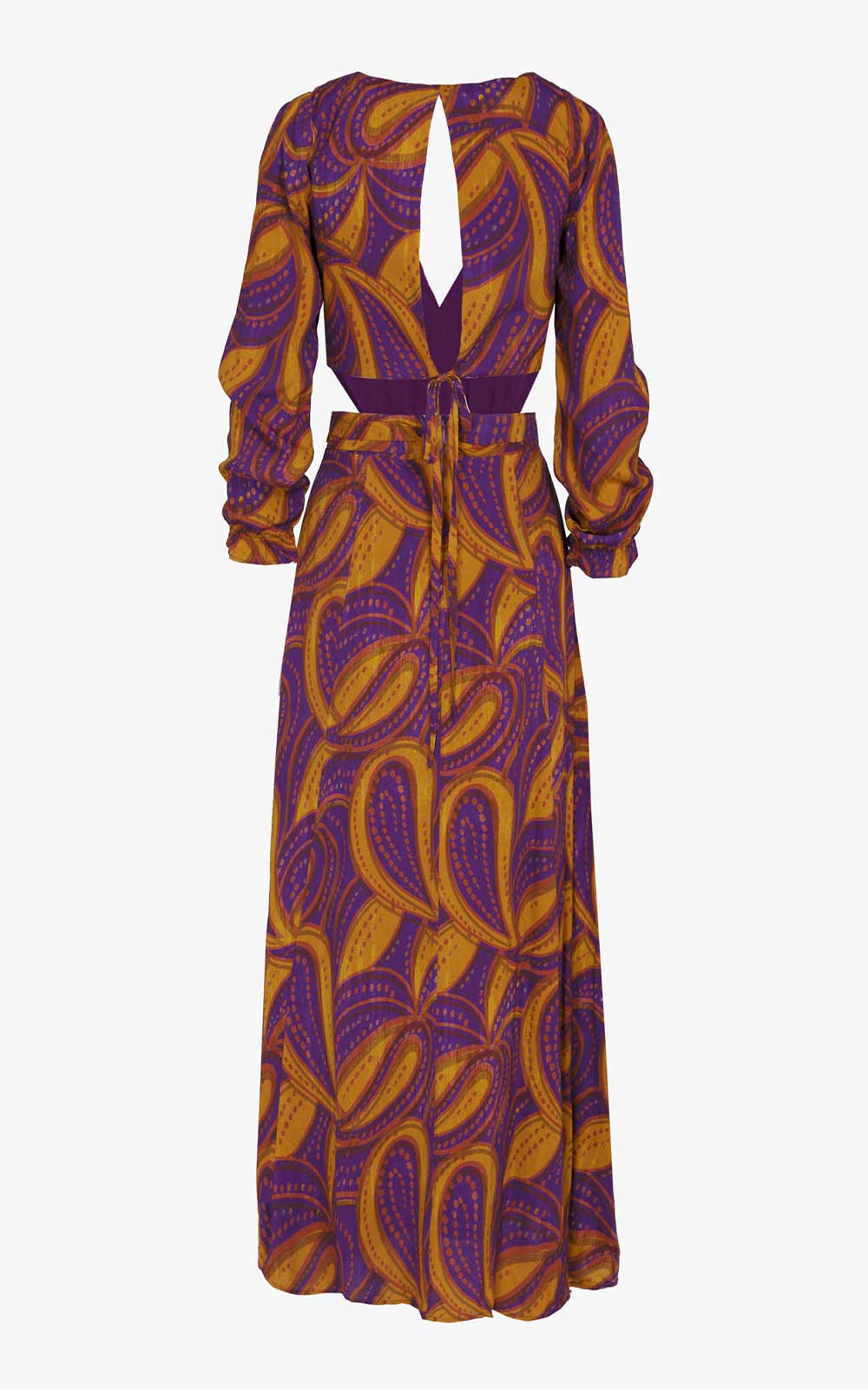 Long dress with a purple and mustard print simulating the fall of tropical leaves. It has a V-neckline and a mini cut-out at the waist with sleeves finished with gathers. On the back it has a small opening that is tied with straps.