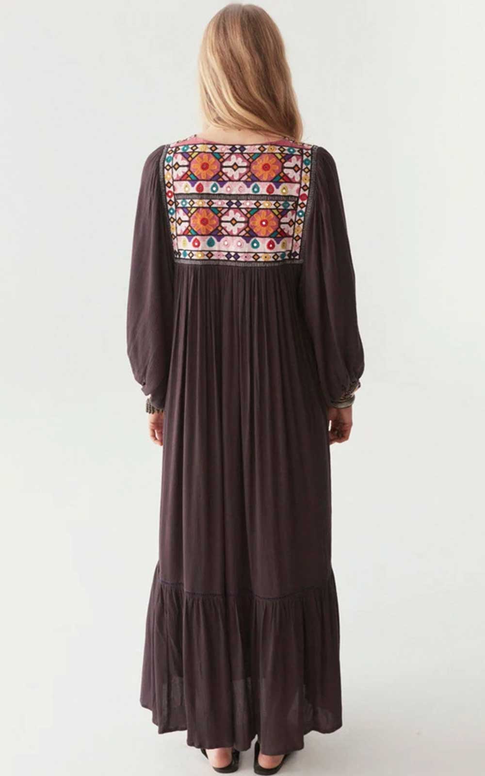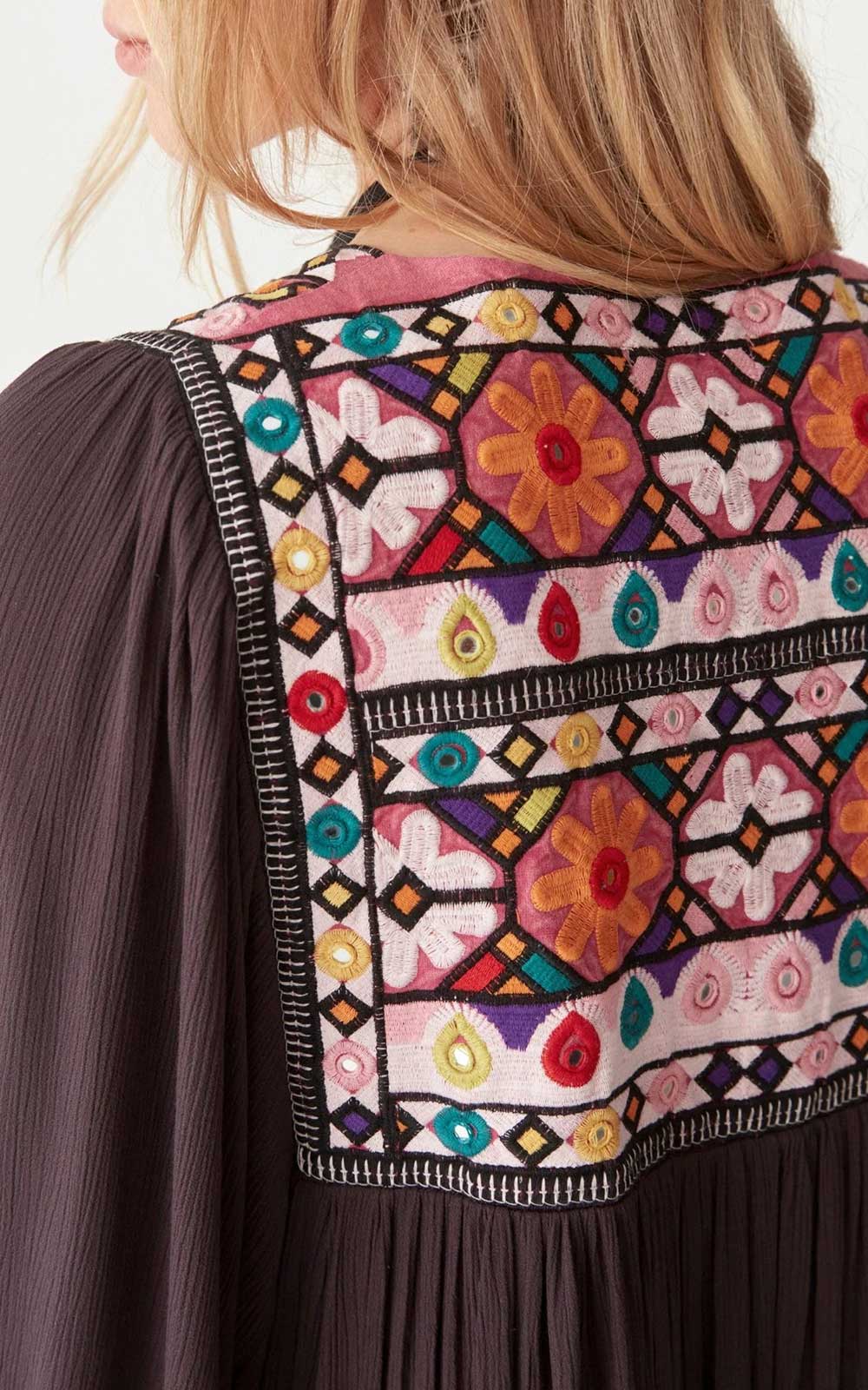- The striking and intricate embroidery that takes over the chest and back with a nearly rebellious contrast.