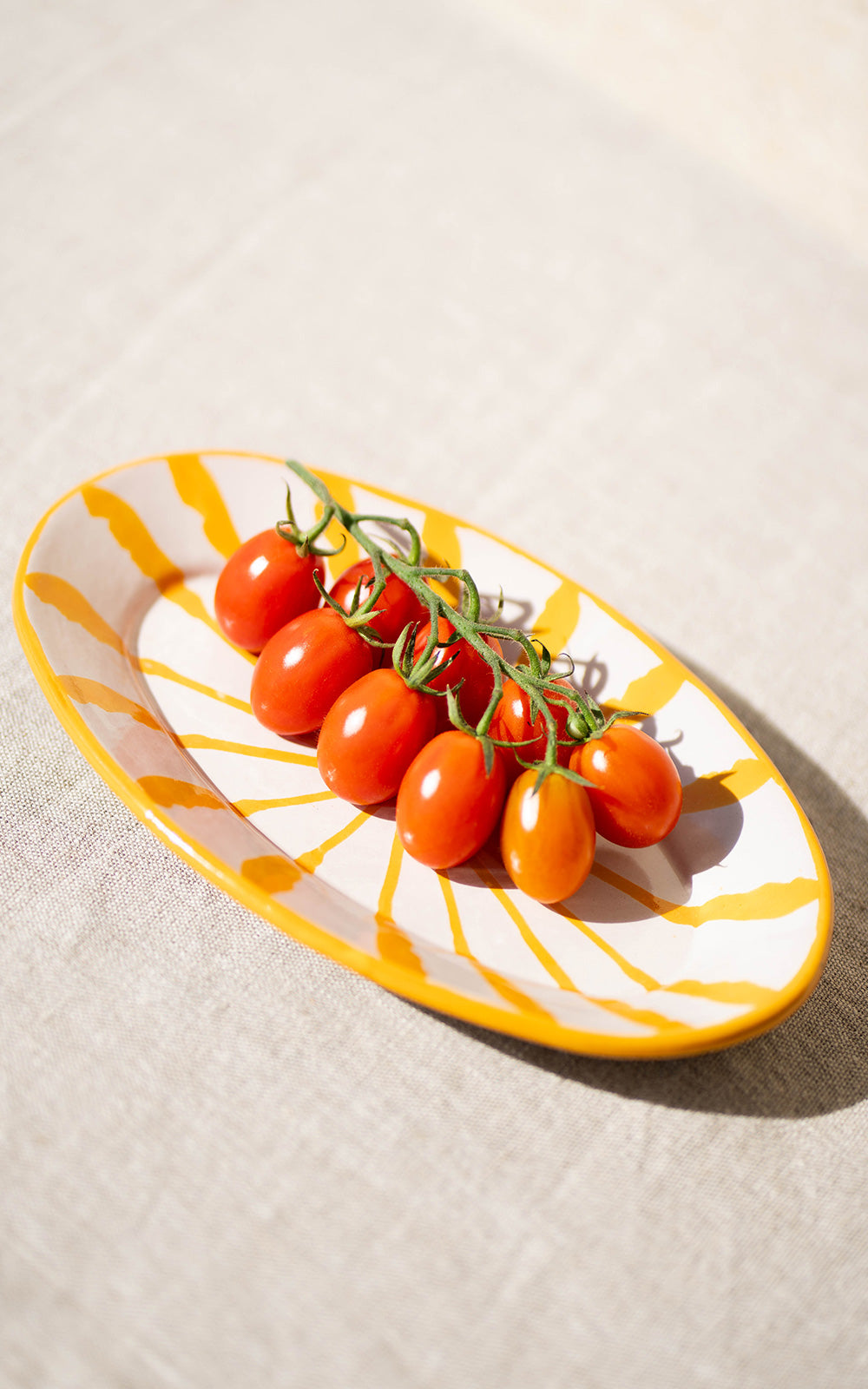 Bandeja de aperitivo de cerámica con diseño de rayas pintado a mano en un taller de artesanos de Granada.
