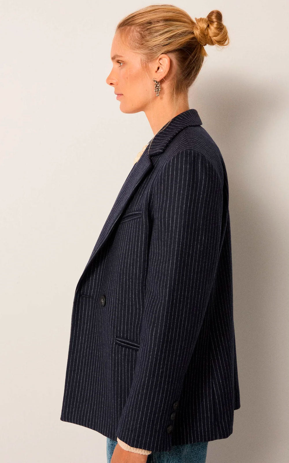 El Blazer Jackie en azul marino está confeccionado en una mezcla de lana ligera con delicadas rayas diplomáticas. Su silueta alargada y cruzada aporta fuerza y feminidad a partes iguales, logrando un equilibrio entre inspiración masculina y presencia elegante.