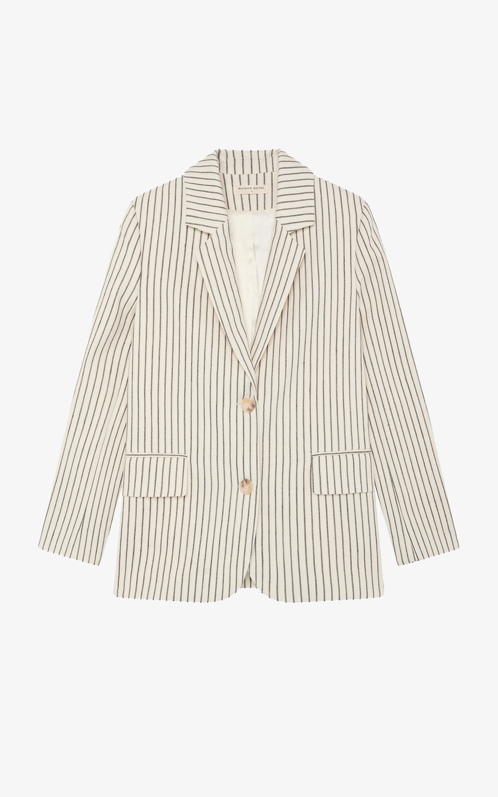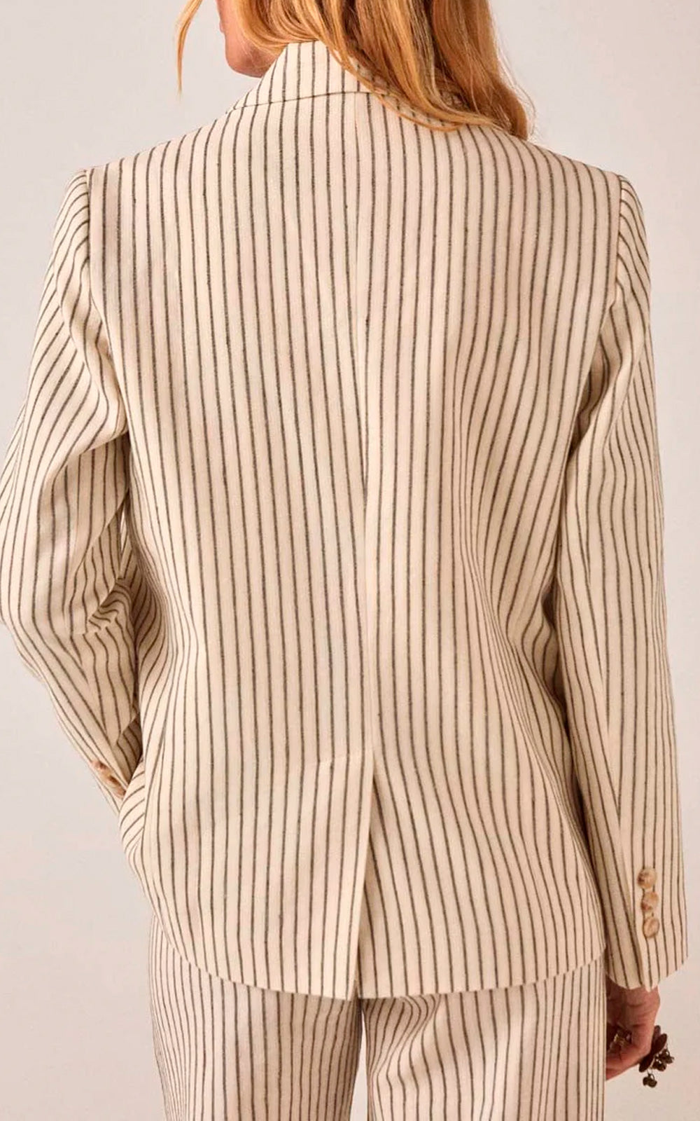 La Bobby Shell es una blazer de verano de sastrería relajada, con raya vertical en gris empolvado y crema que estiliza la silueta con discreción.